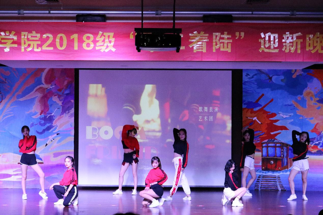由18级各班班导带来的舞蹈串烧+走秀《班导来了》无疑将晚会引入了高潮,班导们的倾情演出赢得了同学们的阵阵欢呼,也代表着各位班导对同学们的欢迎。随后是18经贸2班的歌舞《shining for u》,他们的表演整齐划一、充满了活力。