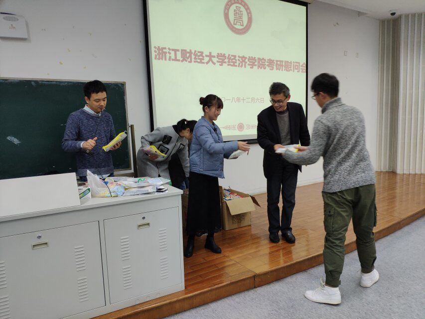随后,沈水法书记与杨小恩副书记为每位考研学子送上学院里精心准备的“考研加油包”。“考研加油包”中有学生们考试专用的各样文具:黑色签字笔、可替换笔芯、2B自动铅笔、2B铅笔芯、橡皮、直尺、修正胶卷、面巾纸、计算器。值得一提的是,加油包中还有一份特殊的礼物——来自各位导师亲自写下的寄语明信片。