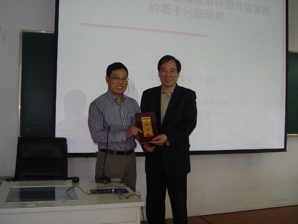 兼职教授,王俊豪院长颁发了证书,并在经贸学院楼105教室为我校广大师生作了题为“关于我省‘十二五’区域经济转型升级发展的若干问题”的学术报告。