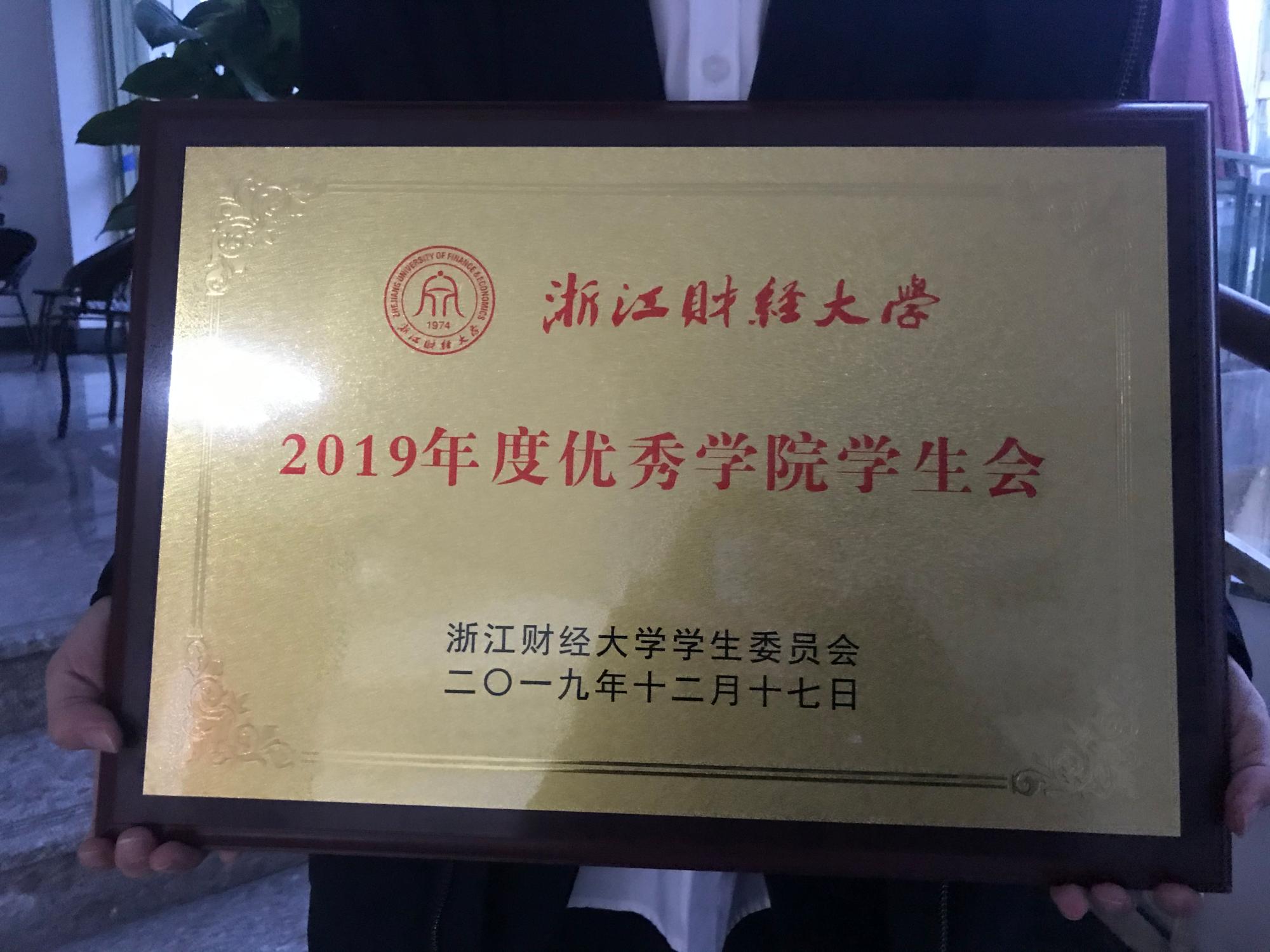 2019年度优秀学生会”,同时学院学生会主席秦静怡荣获优秀学生会主席称号。
