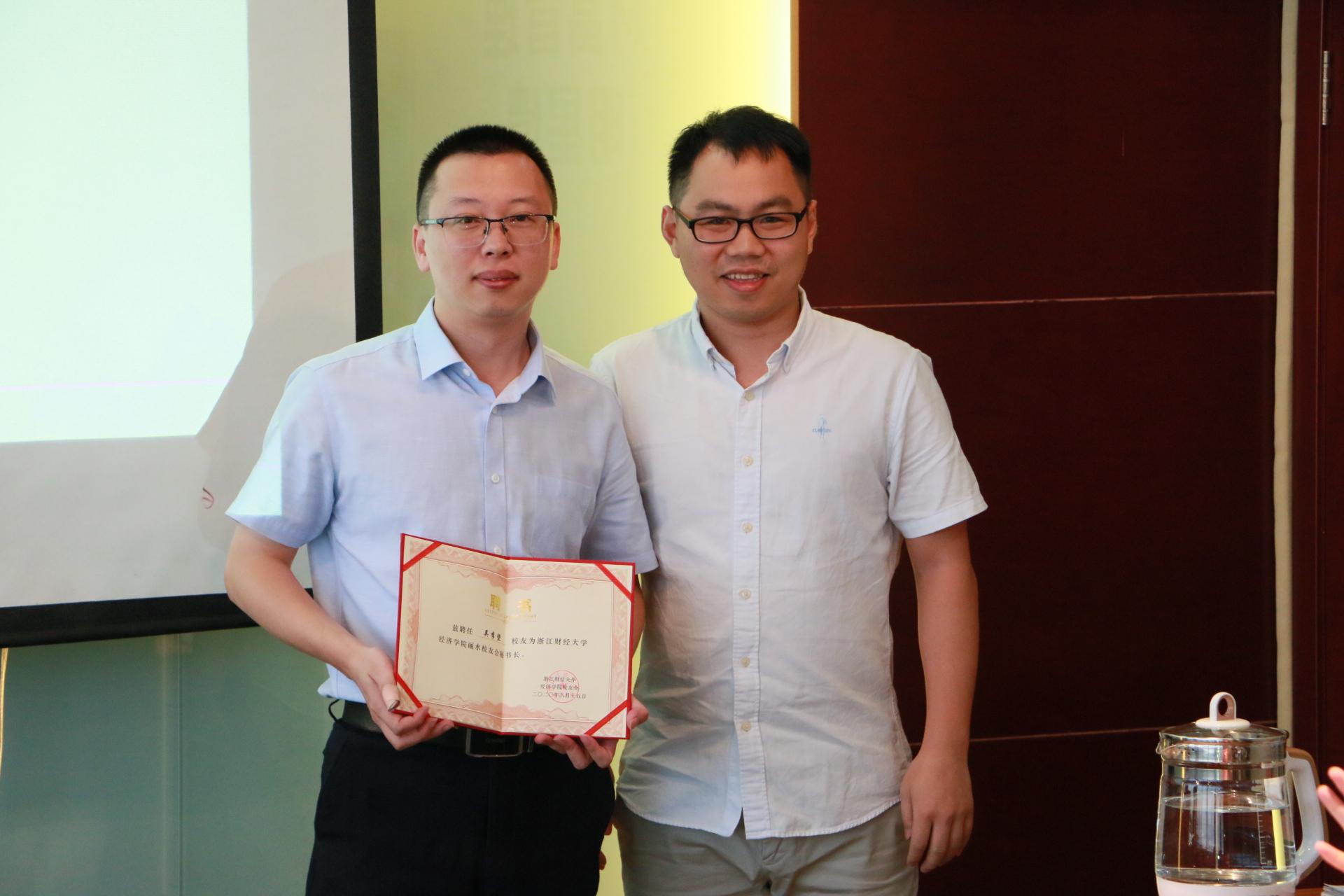 学院副院长罗俊为丽水校友分会秘书长颁发聘书