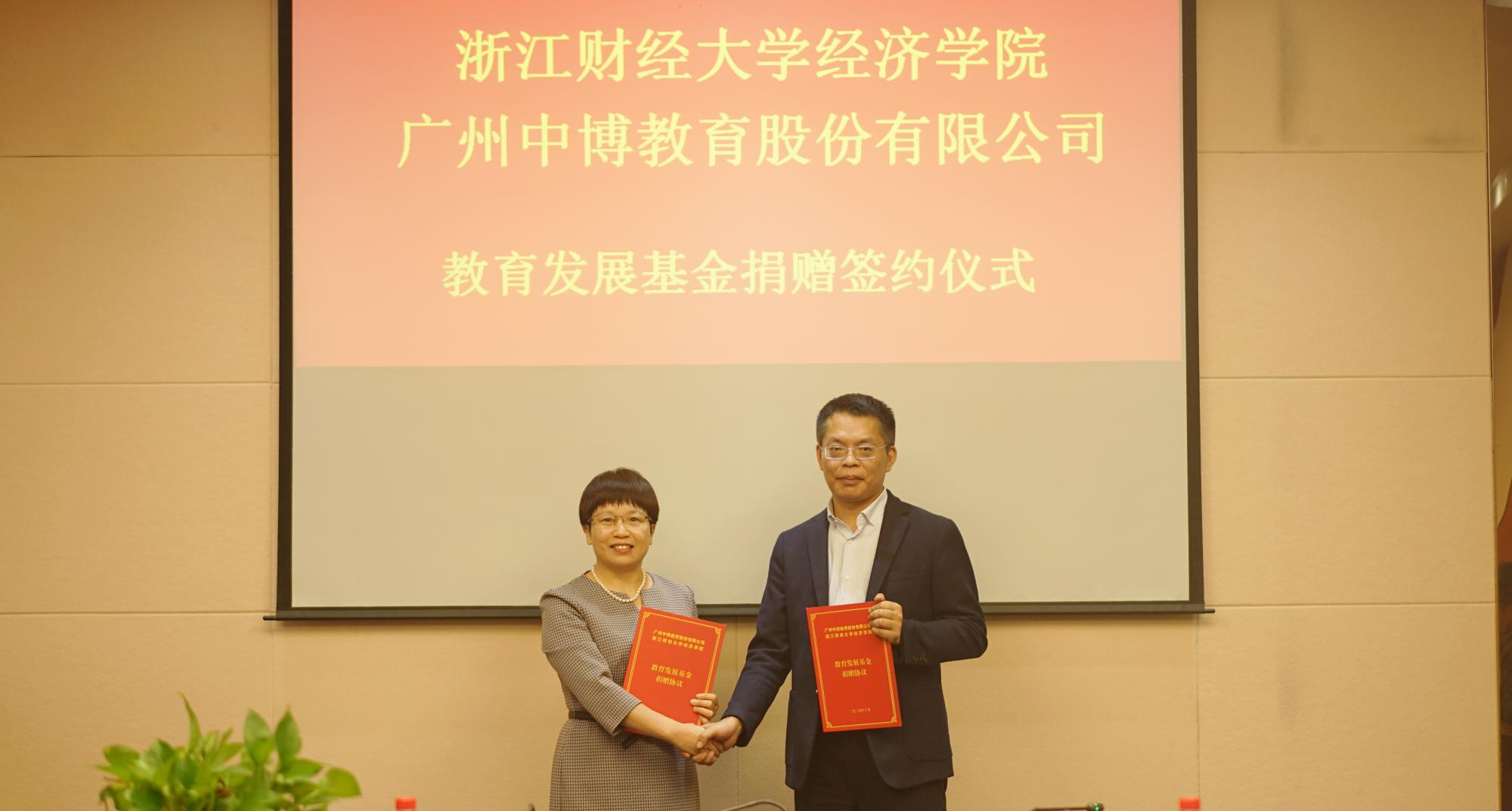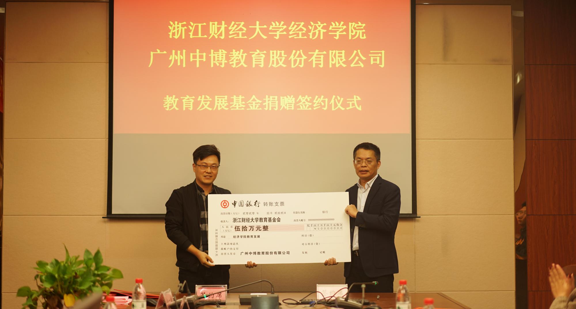 会上,王小和与胡亦琴代表双方签署捐赠协议,王正新代表学院接受了捐赠,中博教育向学院捐赠50万元,用于学院的教育事业发展。