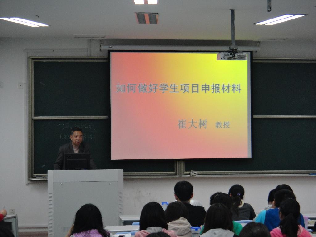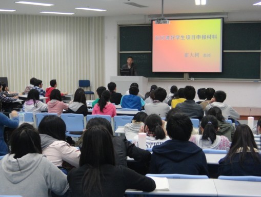 2012年4月6日晚6点40分,在经贸学院楼111教室,崔大树教授应邀作了关于“如何做好学生项目申报材料”的讲座。