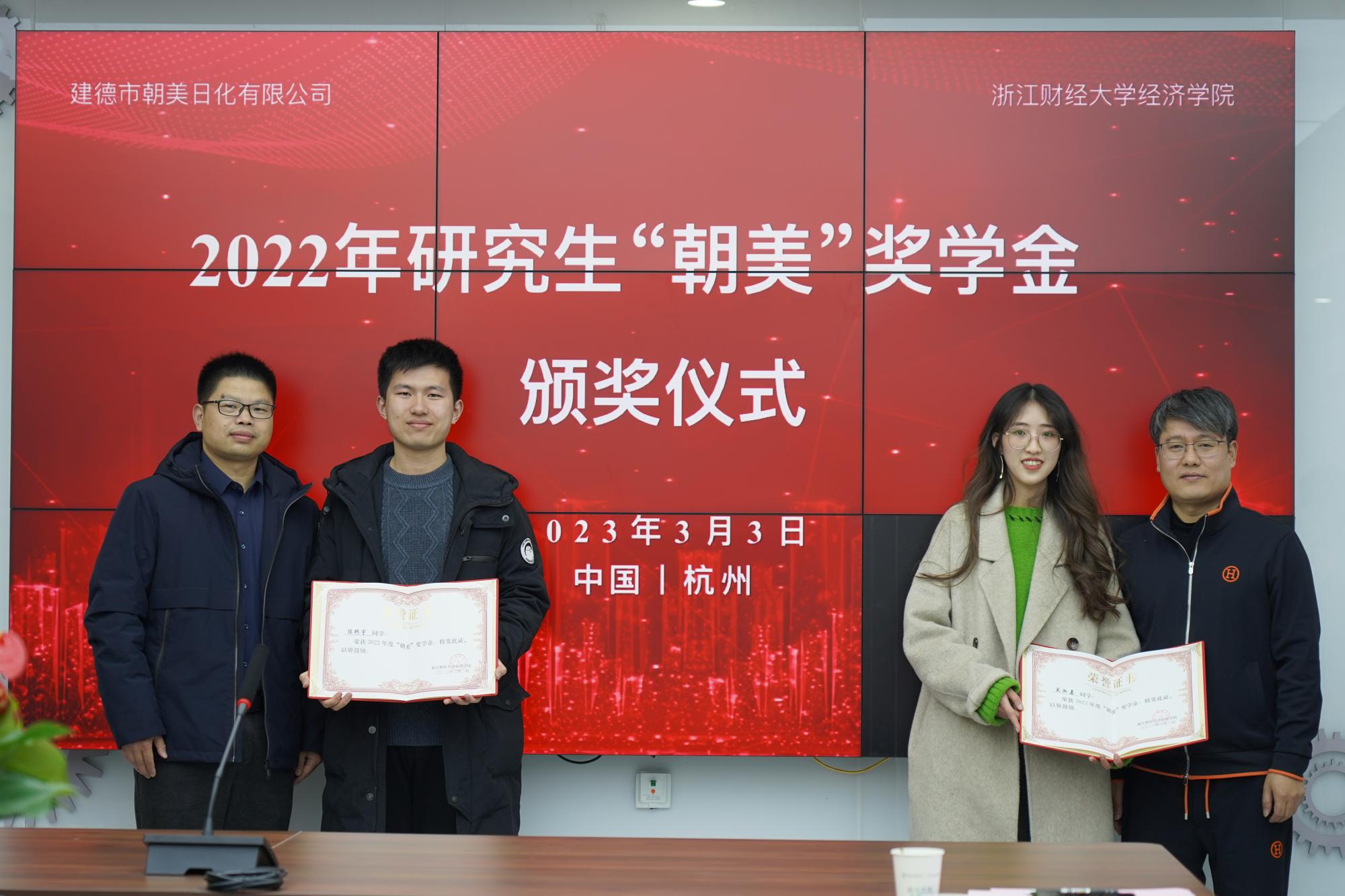 3月3日下午,首届研究生“朝美”奖学金颁奖仪式在建德市朝美日化有限公司举行。公司总经理、学院研究生社会导师林焰伟,公司副总经理、学院创业导师朱利平、胡庆辉,以及学院党委书记胡亦琴,副院长罗俊,党委副书记崔泰铭,副院长邓晓军等出席仪式并为获奖学生颁奖。活动由党委副书记崔泰铭主持。