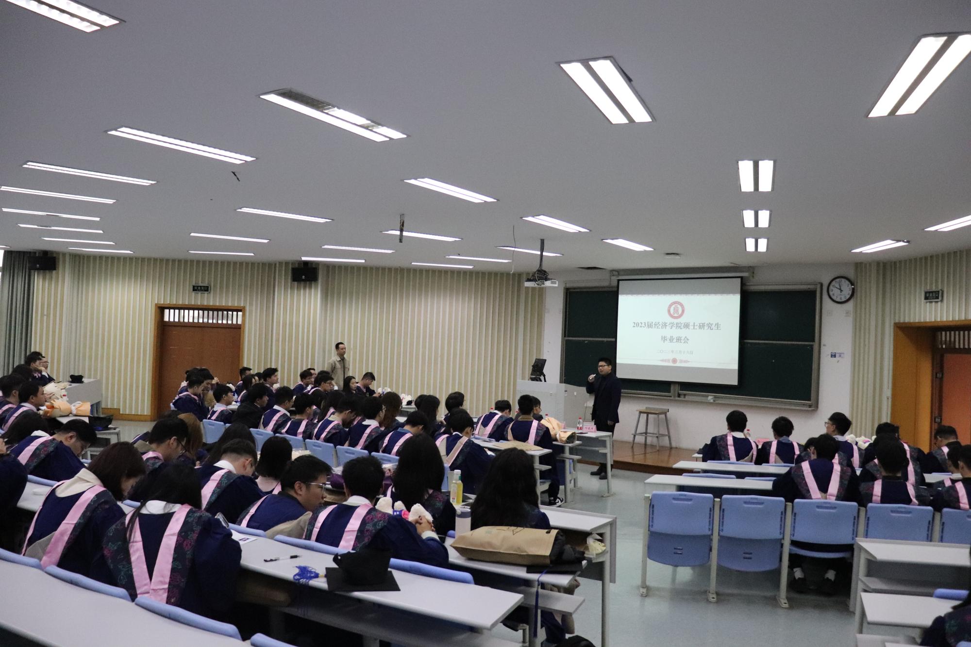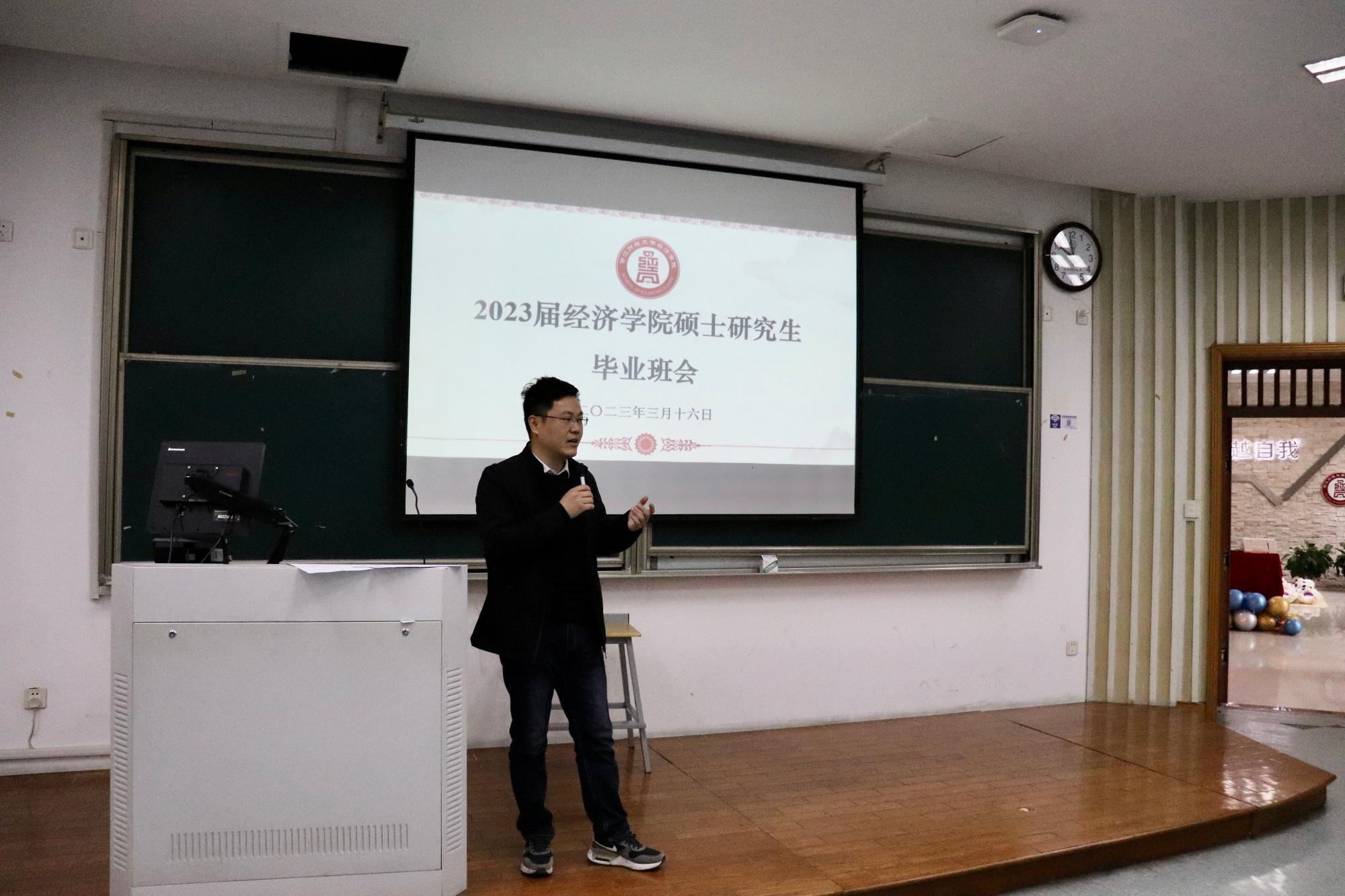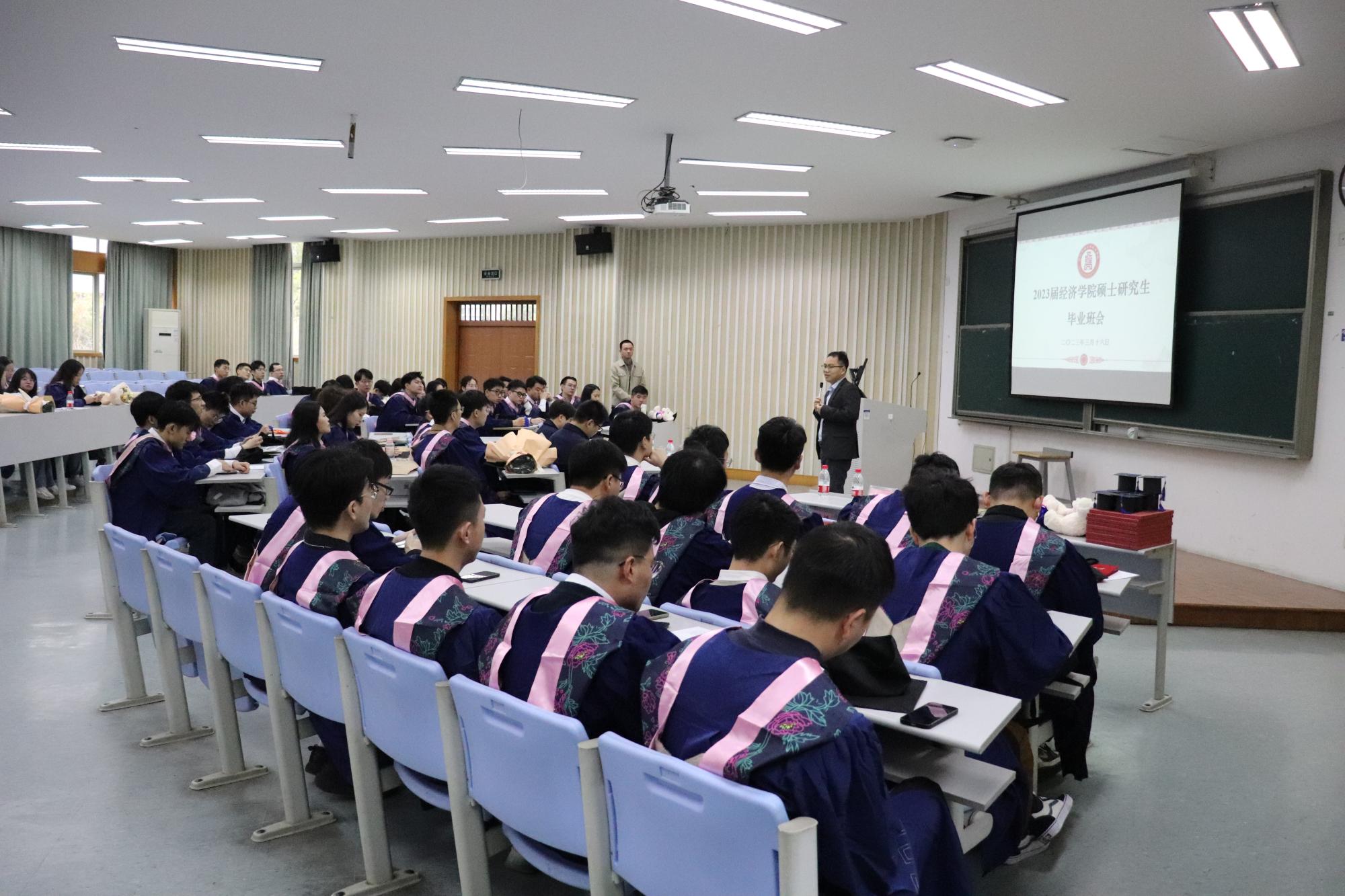 2023届硕士研究生毕业欢送会在学院楼111教室召开。院长王正新、党委书记胡亦琴、副院长罗俊、邓晓军、辅导员俞一献及全体2023届毕业生参加。会议由学院党委副书记崔泰铭主持。