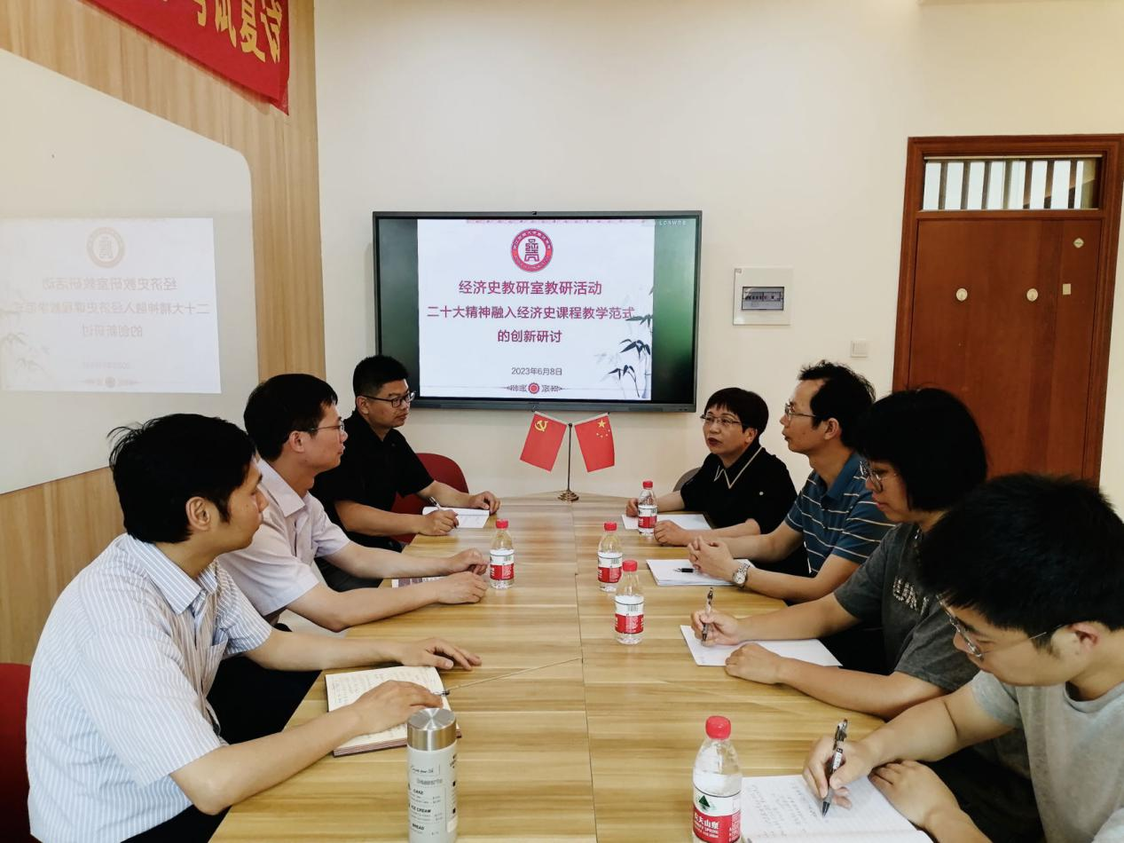 6月9日中午,经济史教研室在学院312会议室召开了“二十大精神融入经济史课程教学范式的创新”研讨会。学院党委书记胡亦琴、副院长邓晓军以及经济史教研室王力、朱海城、麦正锋、黄禾雨、李垚等参加了研讨会。