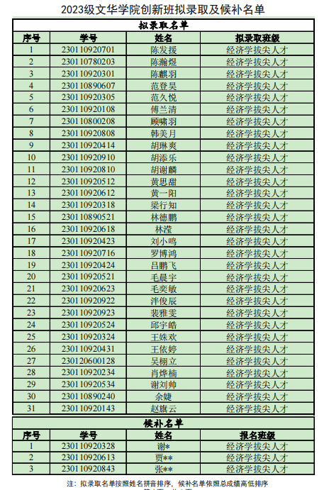 最后,依据选拔笔试与面试的总成绩,并经文华学院创新班人才培养专门委员会审定,现将拟录取名单(见附件)公示如下(公示期为2023年9月13日到2023年9月15日):