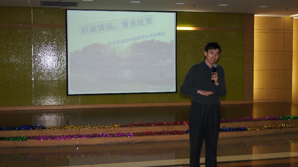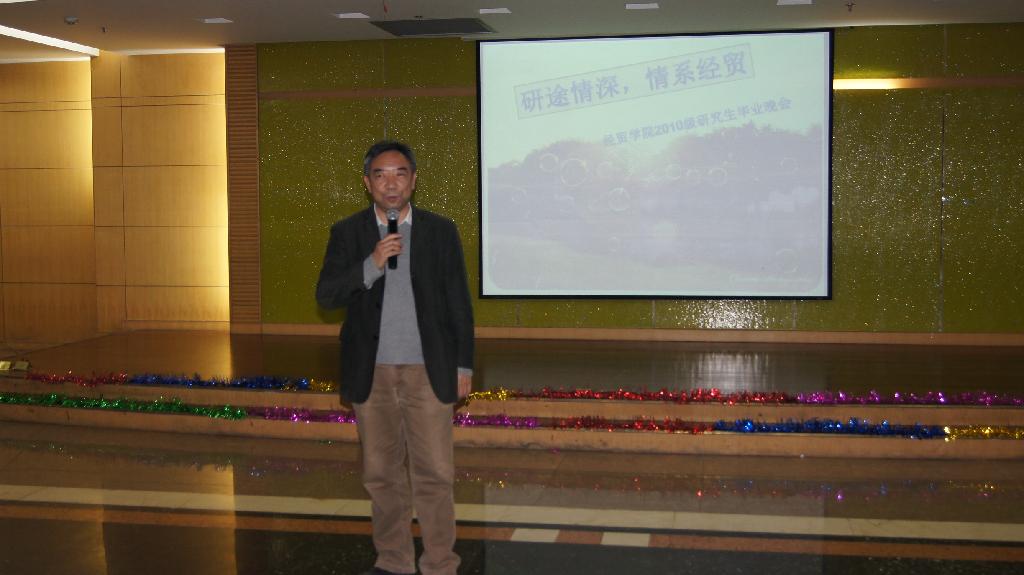 谢院长首先发言,祝贺10级研究生们顺利毕业。他衷心祝愿毕业生事业有成、爱情美满。诙谐不乏恳切的话语一如既往地振奋人心!随后,其他老师也表达了对毕业生们殷切的期望,希望他们以后常回母校。师长的谆谆祝福后,毕业生们也积极发言,字字句句不吝表达了对财院和老师们的真挚感谢和美好祝福!