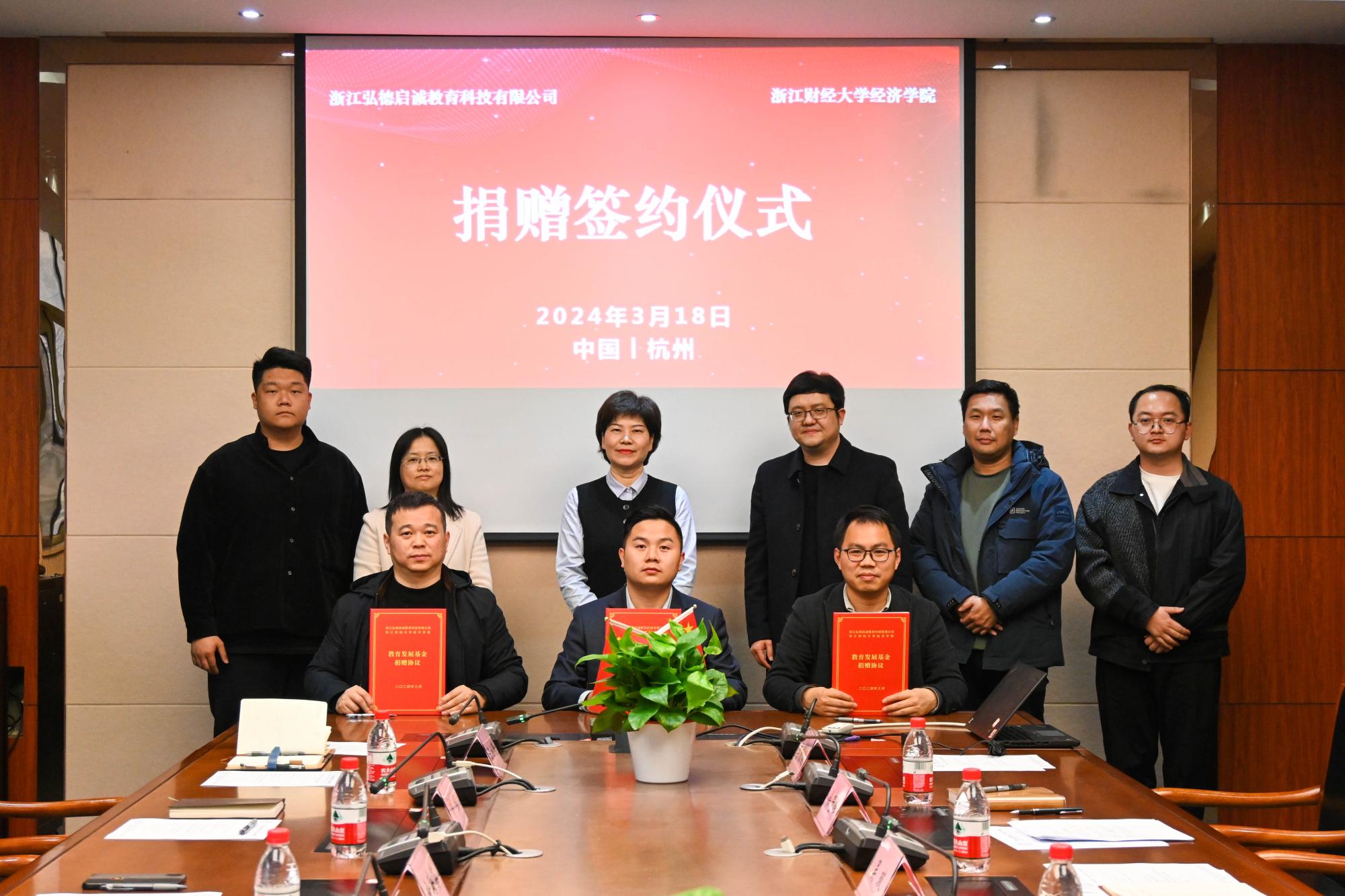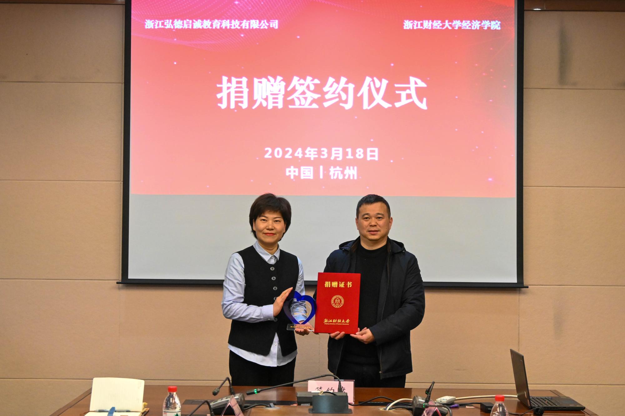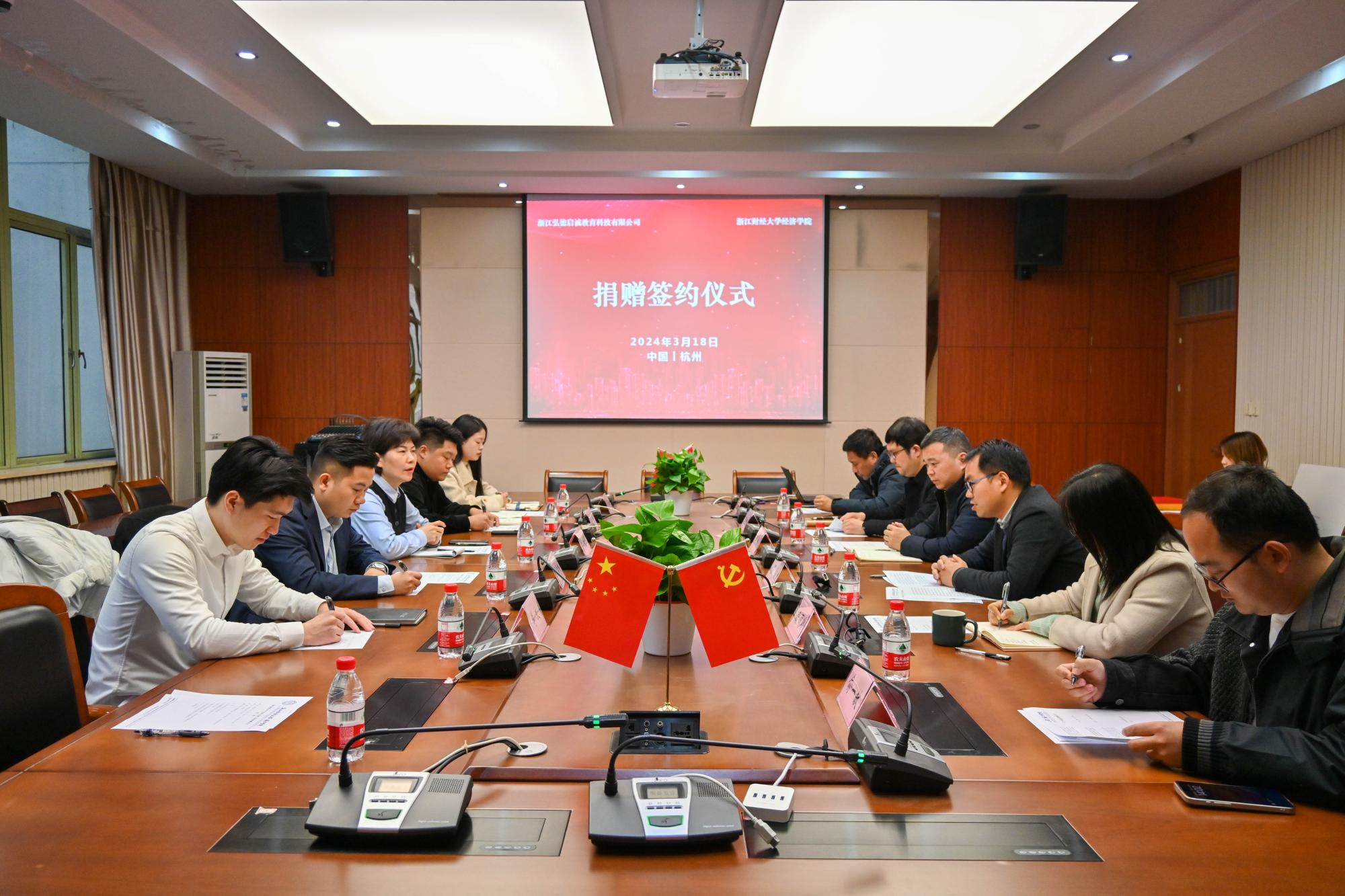 捐赠仪式在学院楼210会议室隆重举行。弘德教育副总裁金海芬、弘德启诚教育董事、总经理冯雪林出席仪式,校友办公室主任吴玻、学院院长罗俊、党委书记徐奇伟、副书记徐丽玲、副院长李顺毅等领导出席了捐赠仪式。弘德启诚教育杭州分校校长彭程、李文老师、陈泳琳老师、学院辅导员俞一献等一同出席仪式。仪式由徐奇伟主持。