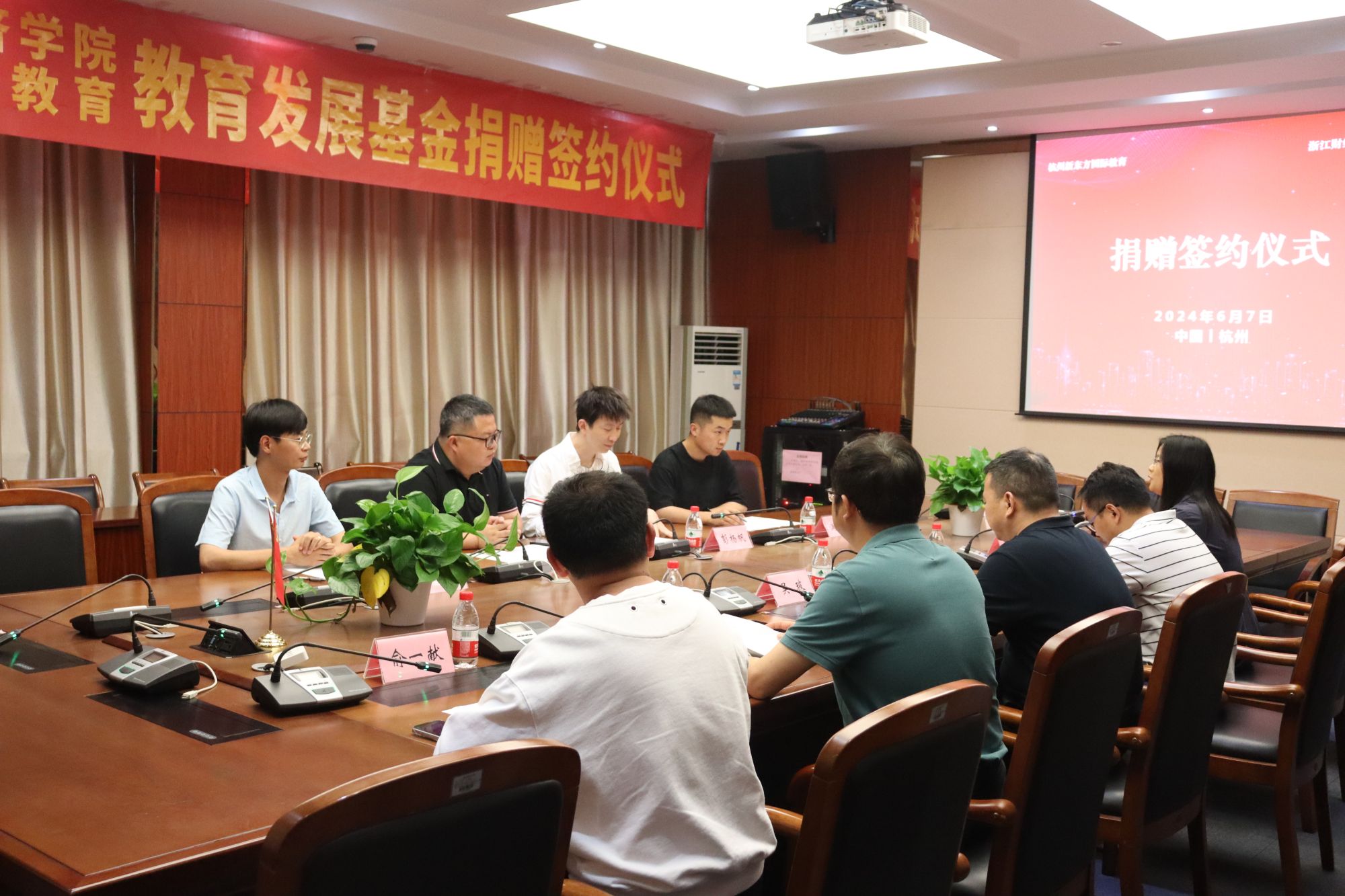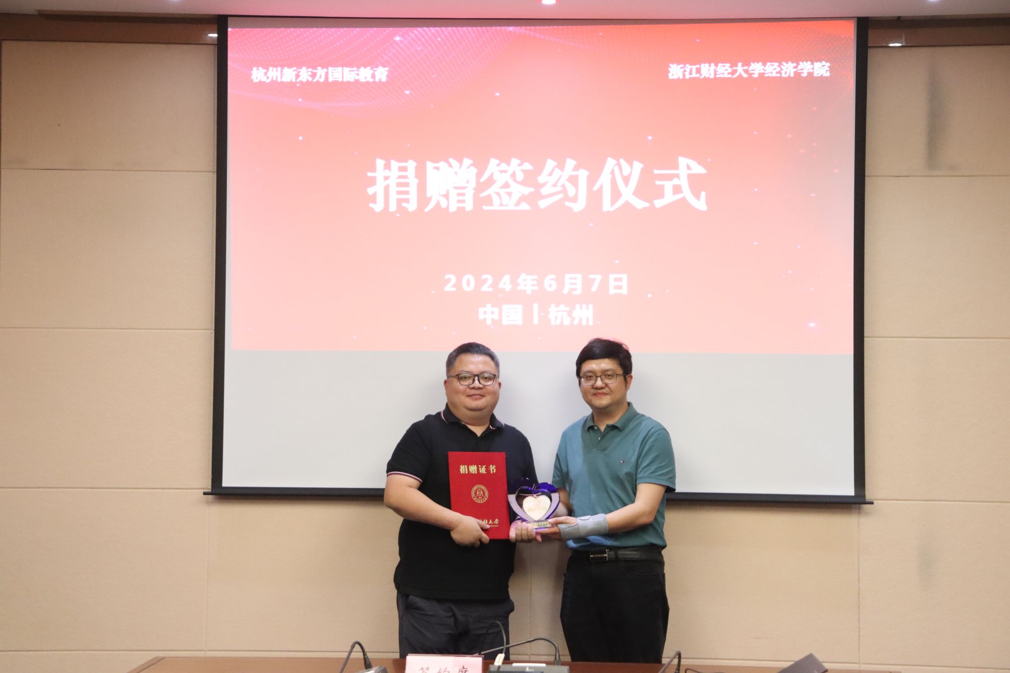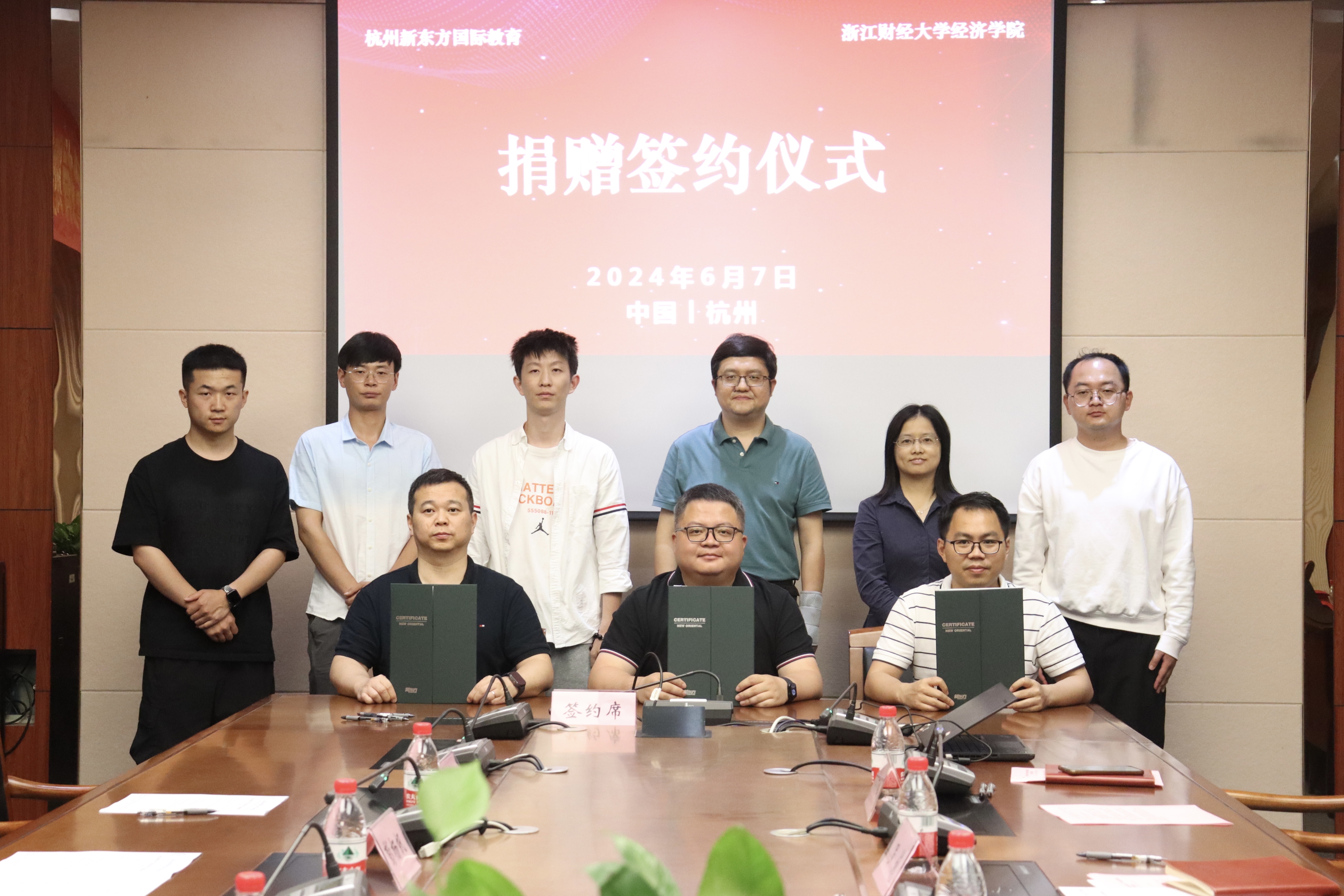 楼210会议室隆重举行。新东方国际教育总经理贺锐奇、市场经理彭杨帆、市场主管张敬选、市场主管满建洲出席仪式,校友办公室主任吴玻、学院院长罗俊、党委书记徐奇伟、党委副书记徐丽玲、团委书记俞一献等一同出席了捐赠仪式。仪式由徐丽玲主持。