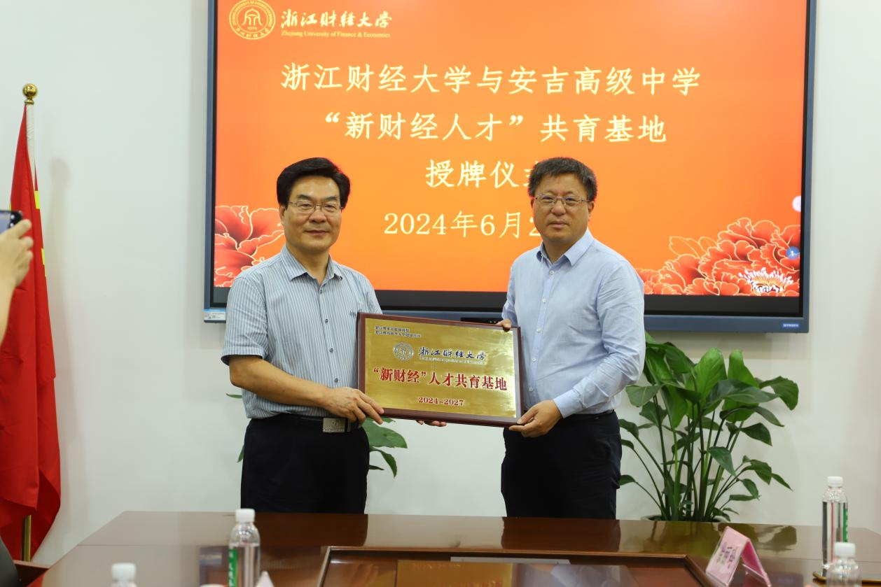 ,向安吉高级中学颁发了“新财经人才共育基地”的匾牌。