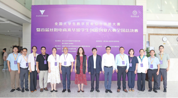 9月28日,第三届全国大学生数字贸易综合技能大赛暨首届丝路电商来华留学生创新创业大赛全国总决赛在学校下沙校区举行。浙江省人大常委会委员、致公党浙江省委会副主委裘云庆,全国政协委员、副校长郑亚莉,全国大学生数字贸易综合技能大赛秘书长易建安出席总决赛开幕式。