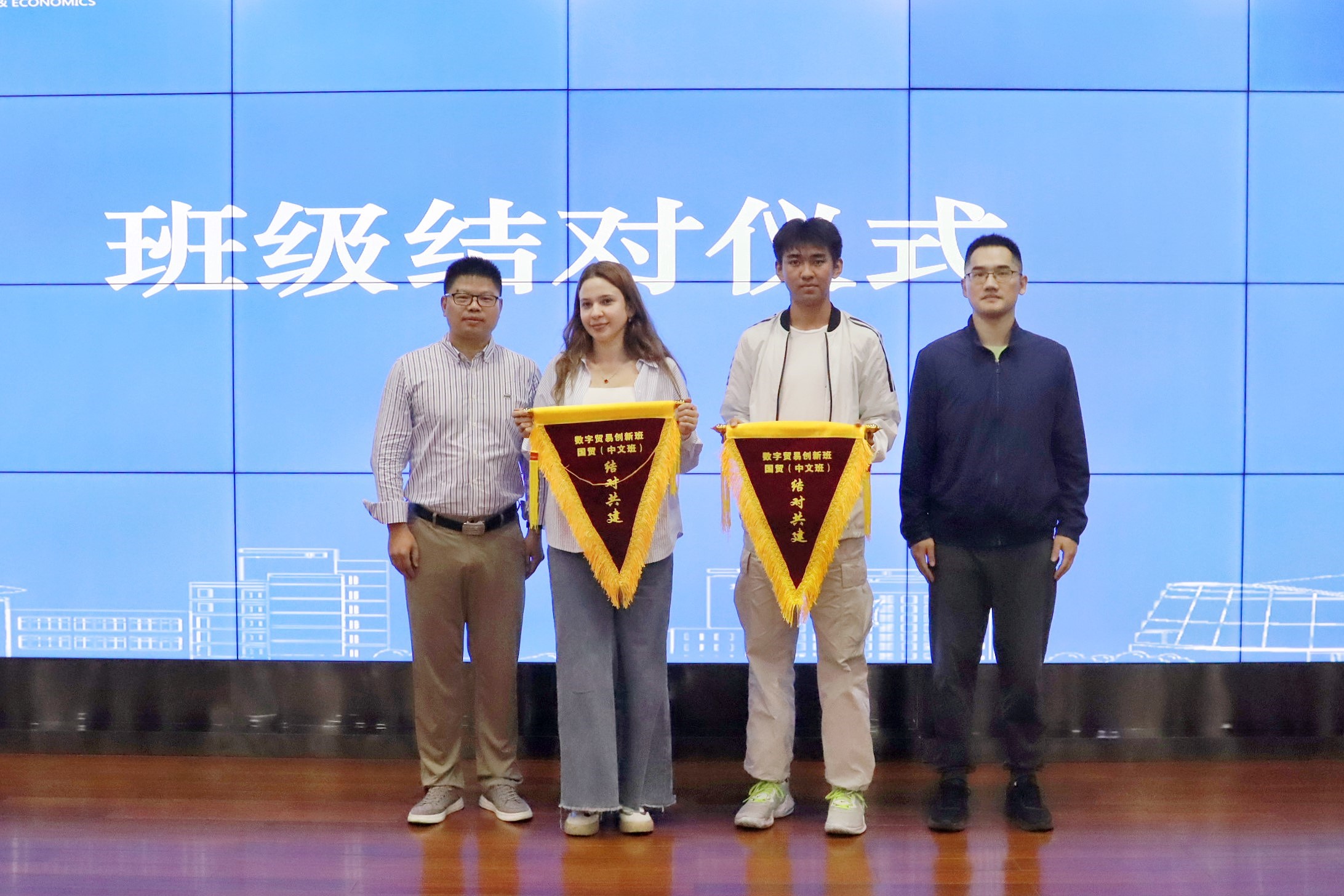 副院长邓晓军、国际学院副院长黄志雄为结对班级代表授予合作共建旗帜。