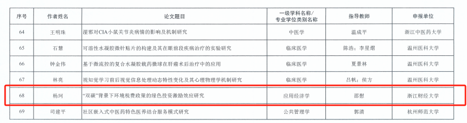 在评选中再创佳绩,共2篇学位论文入选。邵慰老师指导的博士学位论文《“双碳”背景下环境税费政策的绿色投激励效应研究》(学生:杨珂)获评浙江省优秀博士学位论文提名论文;罗俊老师指导的硕士学位论文《政府补贴:市场规模与企业创新行为——一个基于高新技术产业的实验研究》(学生:戴瑞楠)获评浙江省优秀硕士学位论文。其中,杨珂的博士学位论文是全省唯一入选的应用经济学一级学科优秀博士学位论文提名论文。本次全省共评选122篇优秀硕士学位论文,理论经济学入选2篇,戴瑞楠的硕士学位论文为其中之一。