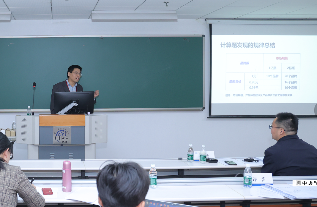 本届“同课异构”教学竞赛以“数智赋能”为主题,探索打造智慧课程。黄达强老师以“方寸之间见天地,细微之处有乾坤”为题,结合《微观经济学》的课程特点,进行课程思政创新报告,从思政理念、教学方法、价值引领、落地应用等方面,详细深入地汇报了关于思政元素如何融入财经类核心课程的实践与经验。在后续的现场教学环节,黄达强老师以“需求价格弹性”这一核心知识点教学节段为例,生动呈现了包括思政融入、数智赋能以及经济学实验教学法在实际课堂中的应用,获得现场评委一致肯定与好评。刘毅群老师以“第三章 产业内平行贸易:新贸易理论和相似需求理论”为例,分享了案例教学方法,通过中国的啤酒贸易案例解析贸易现象多样性以及产业内平行贸易的起因,阐释了新贸易理论的核心要义,并分析新贸易理论对企业贸易拓展与政府贸易政策制定的启示。