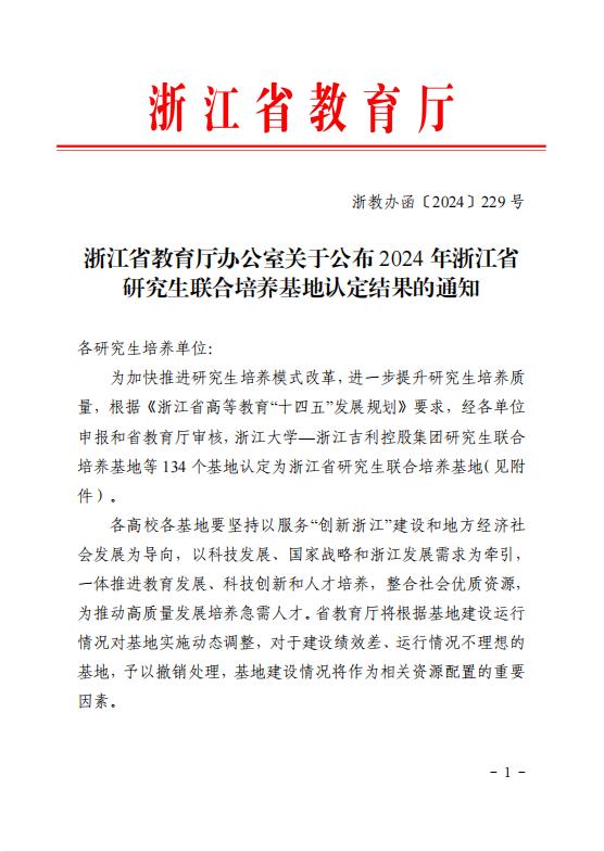 近日,浙江省教育厅办公室发布《关于公布2024年浙江省研究生联合培养基地认定结果的通知》,哔咔