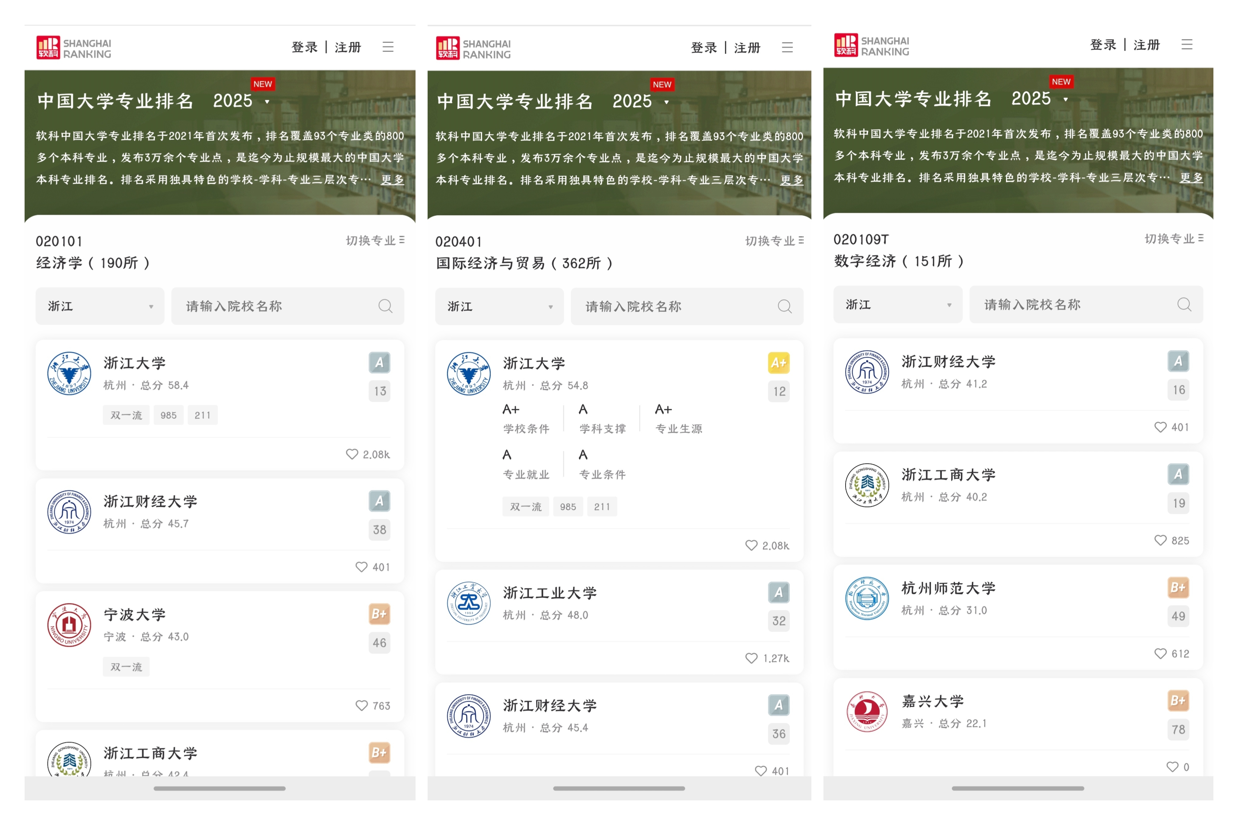 经济学、国际经济与贸易、数字经济三个本科专业再次同时上榜软科A类专业,经济学专业在全国排名第38,在浙江排名第2;国际经济与贸易专业在全国排名第36,在浙江排名第3;数字经济专业在全国排名第16,在浙江排名第1。
