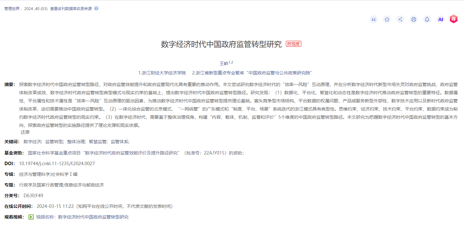 成果简介:探索数字经济时代中国政府监管转型路径,对政府监管效能提升和政府监管现代化具有重要的推动作用。本文尝试研究数字经济时代的“效率—风险”互动原理,并在分析数字经济时代新型市场失灵对政府监管挑战、政府监管体制改革成效、数字经济时代政府监管转型典型模式与现实约束的基础上,提出数字经济时代中国政府监管转型路径。研究发现:(1)数据化、平台化、智慧化和动态性是数字经济时代推动政府监管转型的重要特征。数据属性、平台属性和技术属性是“效率—风险”互动原理的驱动因素,为推动数字经济时代中国政府监管转型提供理论基础。寡头竞争型市场结构、平台数据的权属问题、产品或服务新型外部性、数字技术应用以及新时代政府监管体制改革,迫切需要推动中国政府监管转型。(2)一体化综合监管的北京模式、“一网统管”的广东模式和“制度、平台、场景”系统迭代的浙江模式具有典型性。思维约束、经济约束、技术约束、平台约束、数据约束成为制约数字经济时代政府监管转型的现实约束。(3)在数字经济时代,需要基于整体治理视角,构建“内容、载体、机制、监督和评价”5个维度的中国政府监管转型路径。本文研究为把握数字经济时代中国政府监管转型的基本方向,探索政府监管转型的实施路径提供了理论支撑和现实依据。