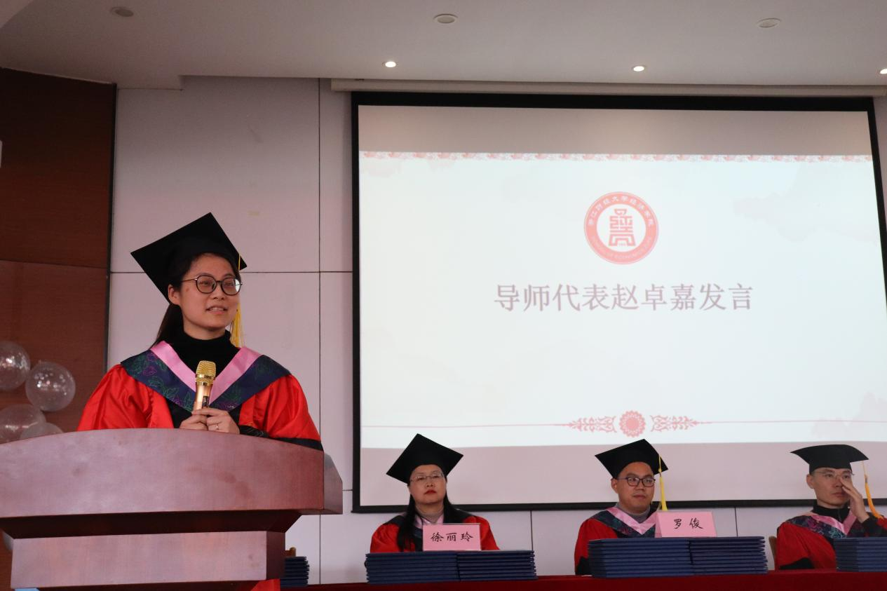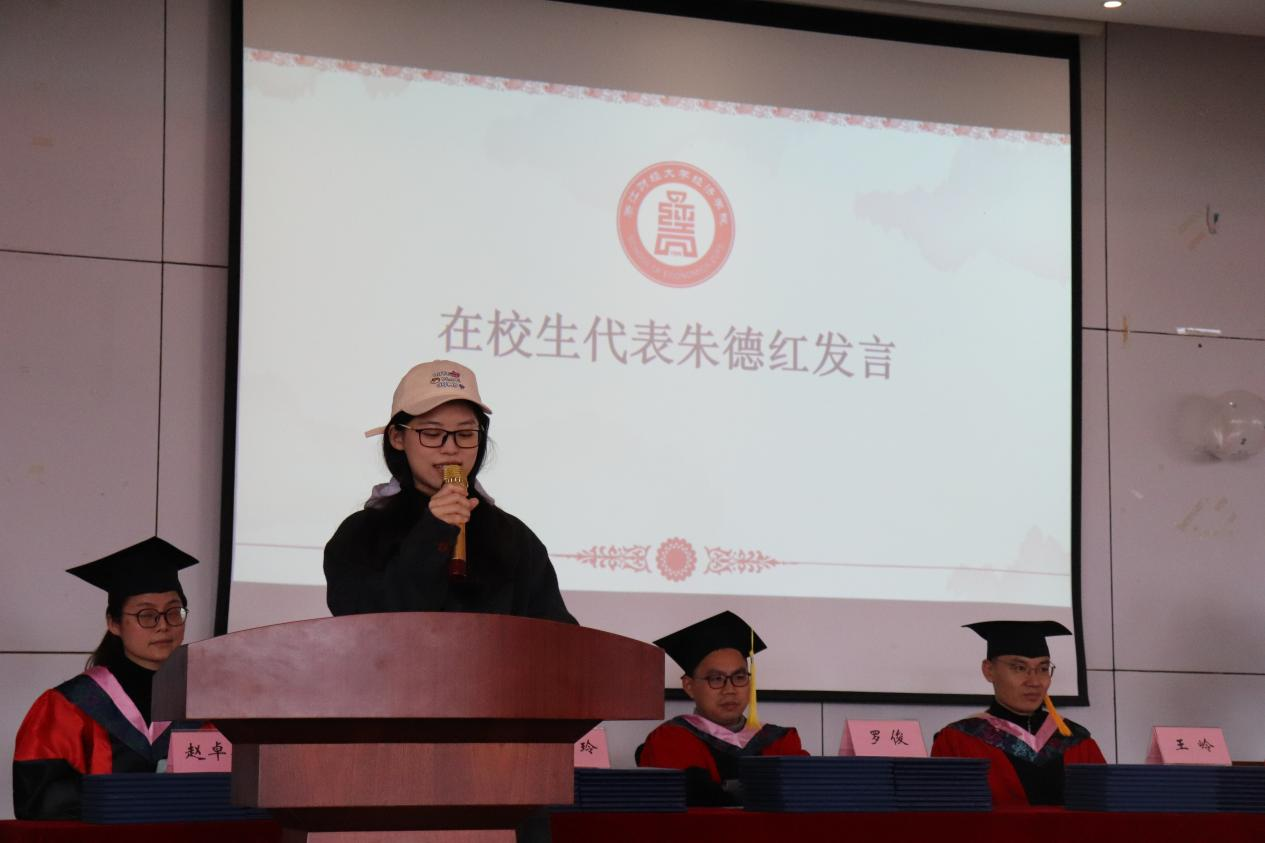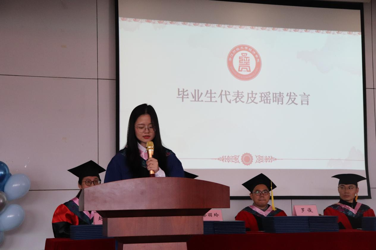毕业典礼上,导师代表赵卓嘉老师、毕业生代表皮瑶晴同学及在校生代表朱德红相继发言。赵老师寄语毕业生不忘初心,持续学习,勇于担当,心怀世界,以开放心态接纳新事物;皮瑶晴同学深情回顾浙财时光,感谢师长教诲与同窗陪伴,展望美好未来;朱德红同学则代表在校生,表达了对学长学姐的感激与祝福,期待他们前程似锦,人生精彩纷呈。