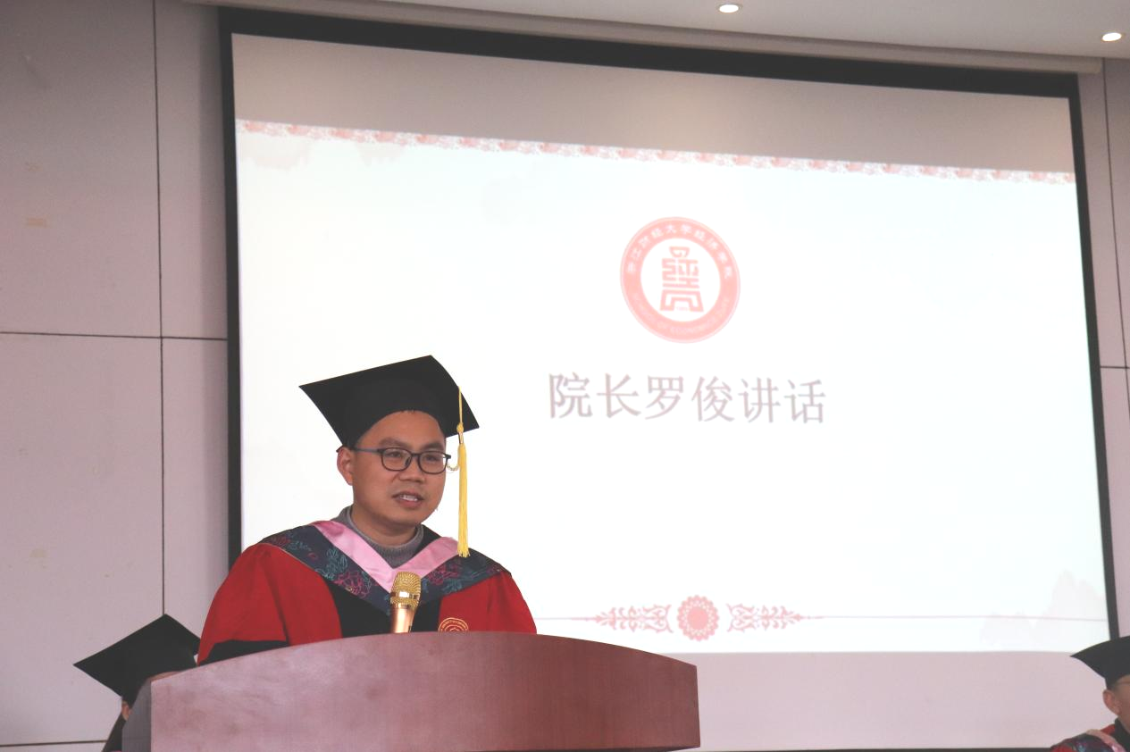 学院院长罗俊在2026届国际商务专业毕业典礼上深情致辞,他首先向毕业生们圆满完成学业致以热烈祝贺。随后,他提出三点殷切希望:立好志,成为国际经贸交流的栋梁;读好书,不断汲取知识,赋能职业发展;做好人,以高尚品德赢得尊重与信任。罗院长勉励毕业生保持大气、正气与勇气,勇敢迎接未来挑战。最后,他表达了对毕业生的不舍与期待,祝福大家商通天下,前程似锦!