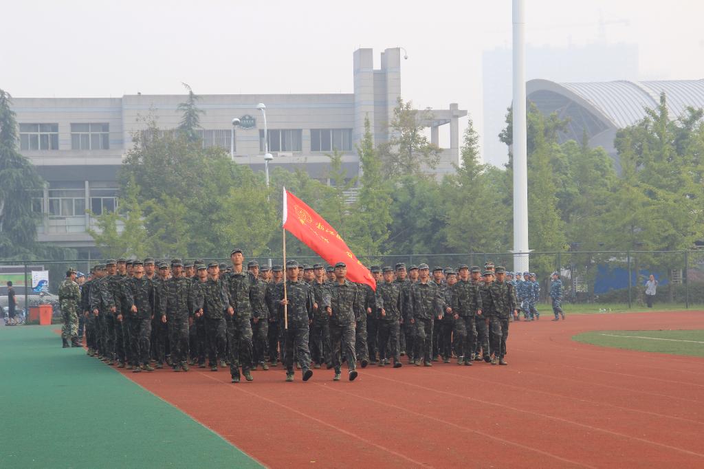 新生们早早地在操场列队,等待阅兵式的开始。清晨的阳光洒在他们的迷彩服上,柔和而坚韧。迎军旗、升国旗之后,军训师师长问候军训新生:“同学们辛苦了!”“为学校争光!”铿锵有力的回答响彻整个校园。