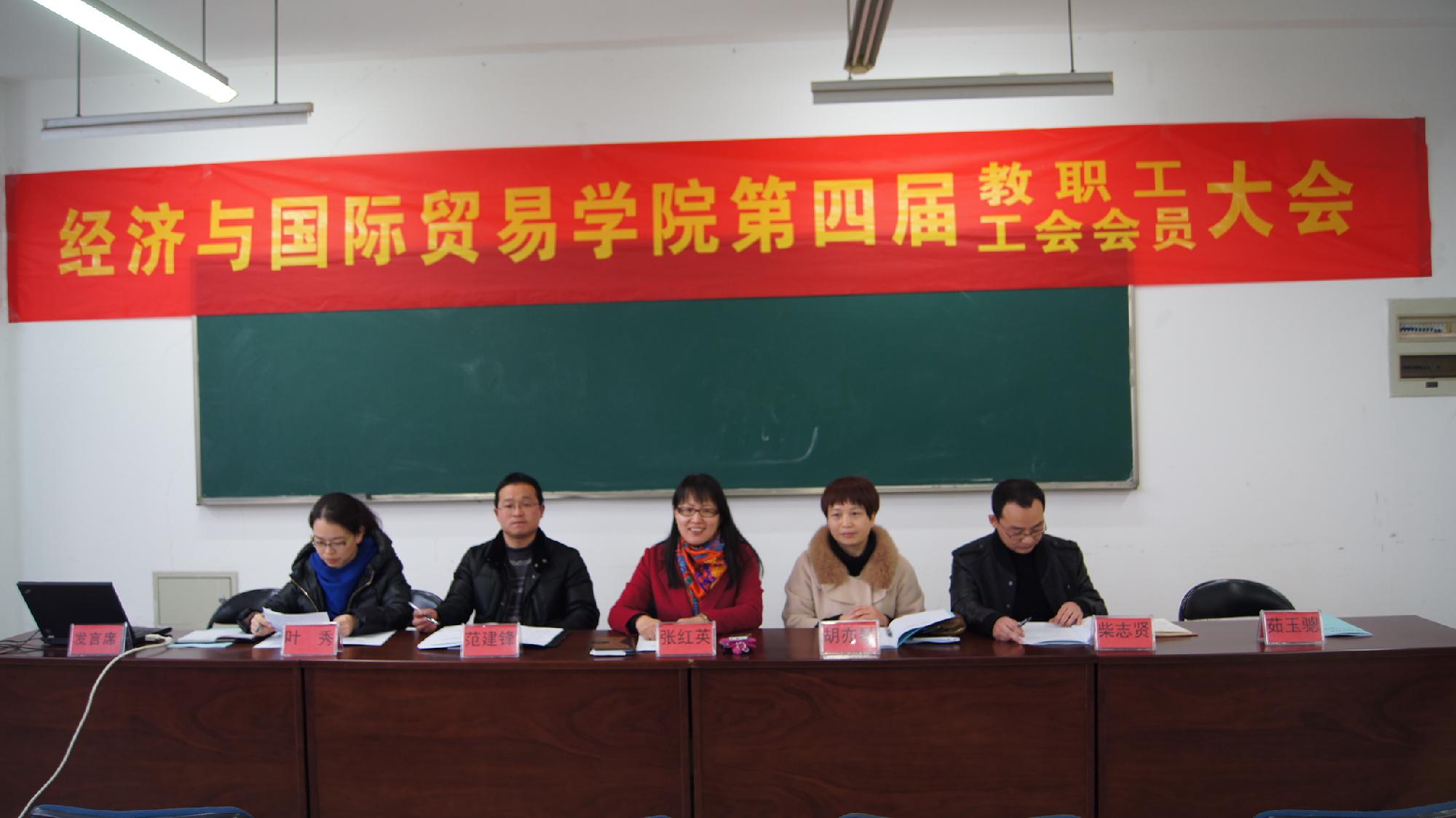 2014年3月4日下午,经济与国际贸易学院第四届教职工暨工会会员大会第一次会议在学院楼313会议室隆重举行。校工会副主席、会计学院党总支书记张红英、学院党政领导以及全体教职工出席了大会,会议由学院党总支副书记叶秀主持。