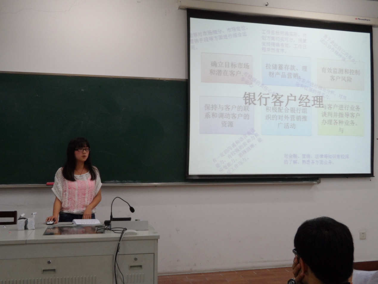 5月8日晚6点30分,由经贸学院团委主办的大学生职业生涯规划大赛在学院楼103教室举行。活动由校就业指导中心的杨忍老师、经贸学院团委书记汪风易以及金融学院朱伊琳担任评委。
