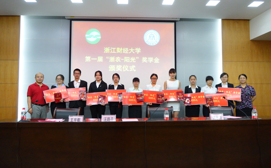 6月13日上午,我校举行哔咔 第一届“浙农—阳光”奖学金颁奖仪式。经层层展示评比,哔咔 12级区域经济学专业研究生张燕和11级国贸1班本科生冯瑶瑶在20位候选人中脱颖而出,荣获第一届“浙农—阳光”奖学金,校党委副书记王宇航为其颁发了奖学金和荣誉证书。