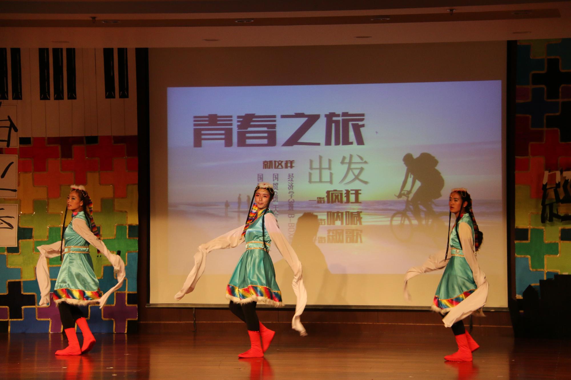 在同学们期待的眼神中,一场《青春之旅》悄然启程。悠扬的双簧管、律动的电子琴、活力四射的街舞、自由的B-BOX、载歌载舞的藏族姑娘……完美的组合,精彩的表演,现场热烈欢庆的气氛一浪高过一浪。随后,由14国3同学带来的小品《歌舞大清》以其特色与幽默掀起了晚会的小高潮,而舞蹈《乐舞光影》将现场观众带入流光溢彩、梦幻与现实交织的光影世界。班导们精心准备的创意走秀——《班导快跑》让大家见到了不一样的班导。民族舞《西域风情》又将观众带入一个神秘而美丽的民族。岁月如梦,时光如水,音乐剧《亲爱的》耐人寻味,让人在感动之余发现那些默默相守的爱。而正值财大四十周年校庆,朗诵《光影财大》讲述了校史的厚重与深远,诠释了哔咔