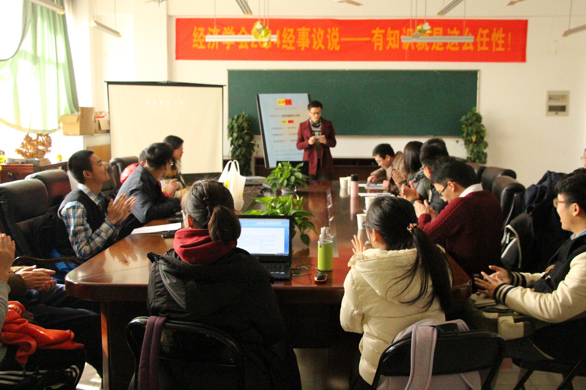 12月16日下午,由经贸学院学生经济学会主办的“2014经事议说”——经济热点问题讨论交流会活动在学院楼313会议室举行。来自杭州电子科技大学学生经济学会,浙江工商大学学生土地与房地产研究协会及我校学生经济学会成员组成的三支代表队参与了此次活动。活动邀请到杭州电子科技大学经济学会指导老师郭爱美和我校经济学会指导老师文雁兵到场指导观看。
