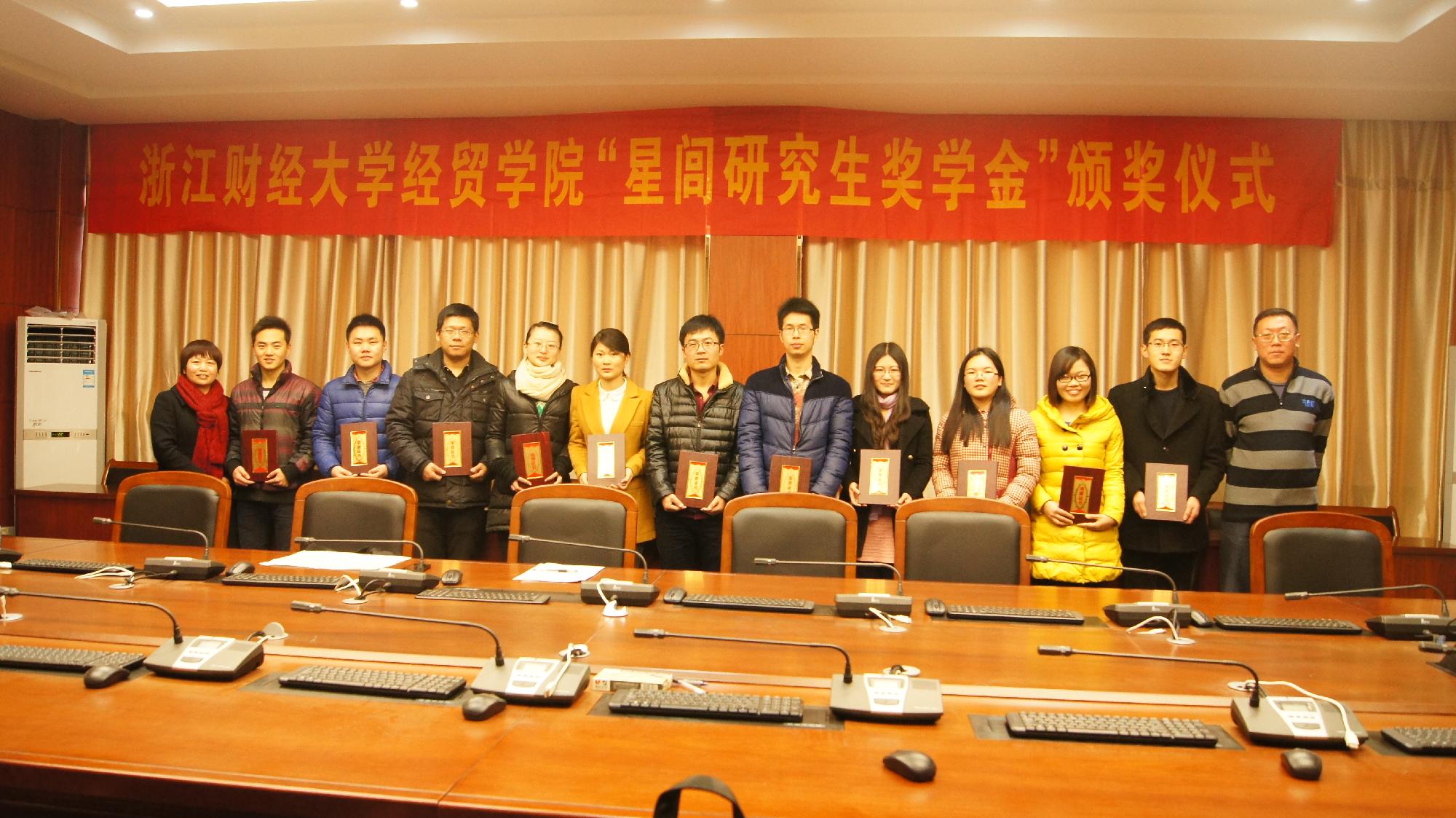 第三届“星闾研究生奖学金”颁奖仪式在210会议室举行,王蔚泉等11名同学获得2014年度“星闾研究生奖学金”荣誉称号,经贸学院院长胡亦琴、副院长柴志贤,院长助理王正新以及导师代表项后军老师出席,学院党总支书记范建锋主持会议。