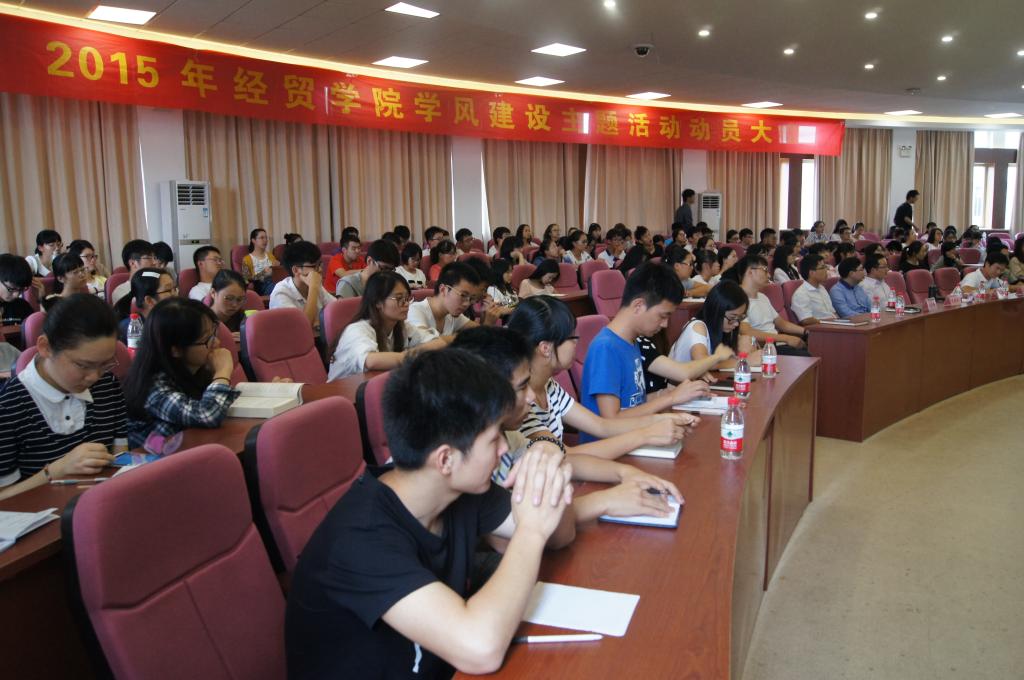 9月22日下午2点,经贸学院2015年学风建设主题活动动员大会暨五星级课堂启动仪式在6号楼219教室顺利举行。院党总支书记范建锋、副书记叶秀、教师代表文雁兵、黄禾雨、崔轩玮、麦正锋、刘毅群、全体辅导员、本科生代表、研究生代表共计两百余人参加了此次活动。