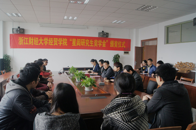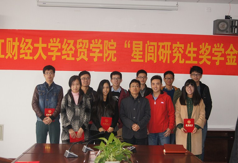卢新波校长为10名获奖学生颁奖并合影留念。一年一度的星闾奖学金,一代一传的星闾精神,必将激励经贸学子不断增加自身理论素质的训练,不断增强自身实践能力的培养,不断促进自身创新能力的提升。