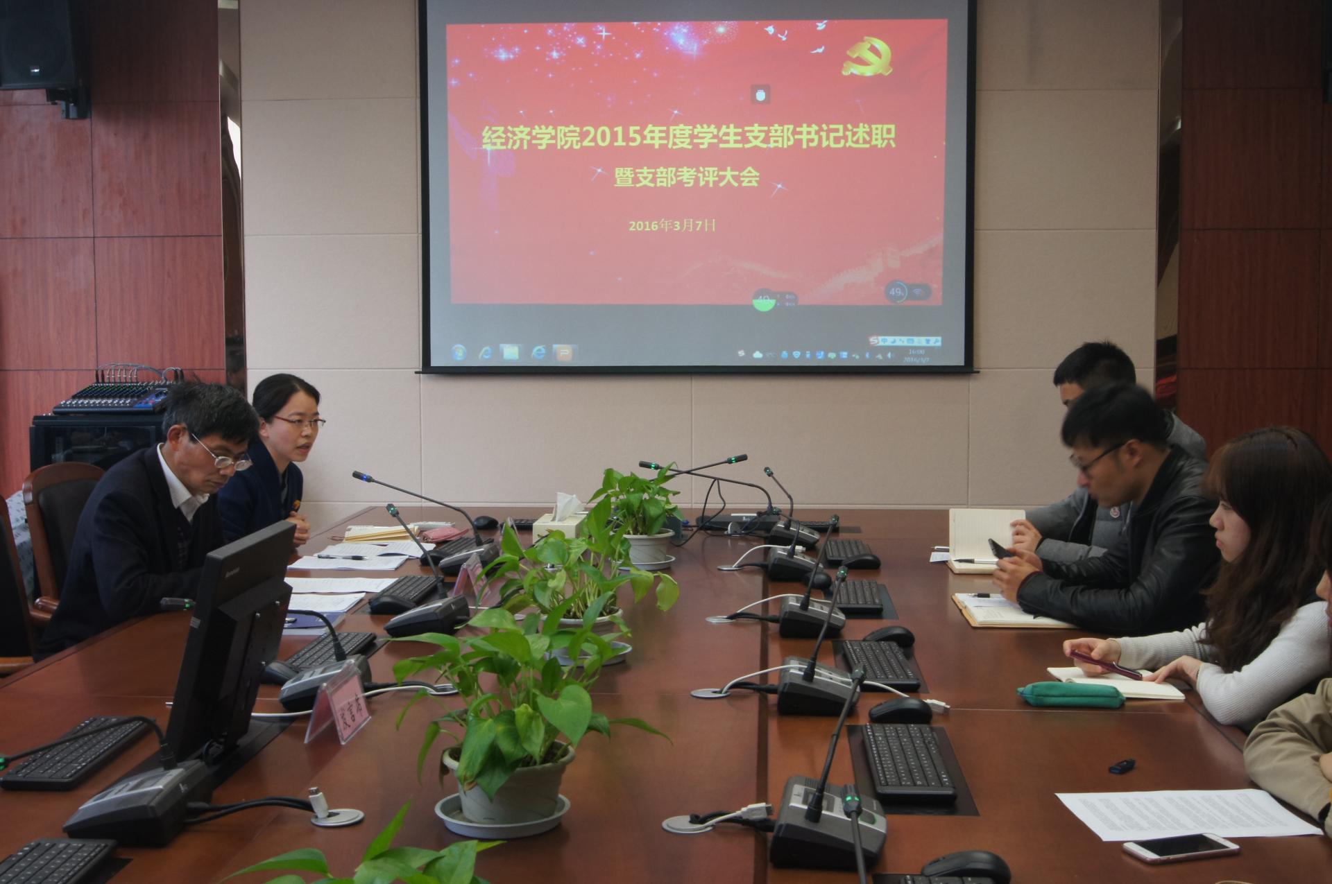 在学院楼210室召开了2015年度学生支部书记述职暨支部考评大会。会议由党总支副书记叶秀主持,党总支书记沈水法、各学生支部书记和部分党员群众代表参加了会议。