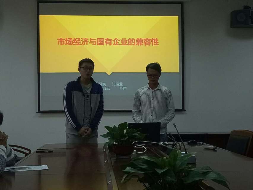 15级“现代经济学实验班”代表队为我们带来的《市场经济与国有企业的兼容性》,从三个方面就市场经济与国有企业是否兼容做了详细的介绍,并分析了国有企业未来的改革趋势。展示完毕后,在提问环节中,两位同学与一位在场观众就国有企业和民营企业在市场资本上的问题展开了讨论交流,气氛热烈。