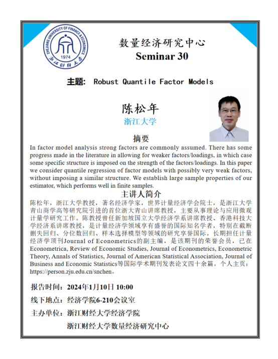 陈松年,浙江大学教授,著名经济学家,世界计量经济学会院士,是浙江大学青山商学高等研究院引进的首位浙大青山讲席教授,主要从事理论与应用微观计量学研究工作。陈教授曾任新加坡国立大学经济学系讲席教授、香港科技大学经济系讲席教授,是计量经济学领域享有盛誉的国际知名学者,特别在截断删失回归、分位数回归、样本选择模型等领域的研究享誉国际。长期担任计量经济学顶刊Journal of Econometrics的副主编,是该期刊的荣誉会员,已在Econometrica, Review of Economic Studies, Journal of Econometrics, Econometric Theory, Annals of Statistics, Journal of American Statistical Association, Journal of Business and Economic Statistics等国际学术期刊发表论文四十余篇。个人主页://person.zju.edu.cn/snchen。