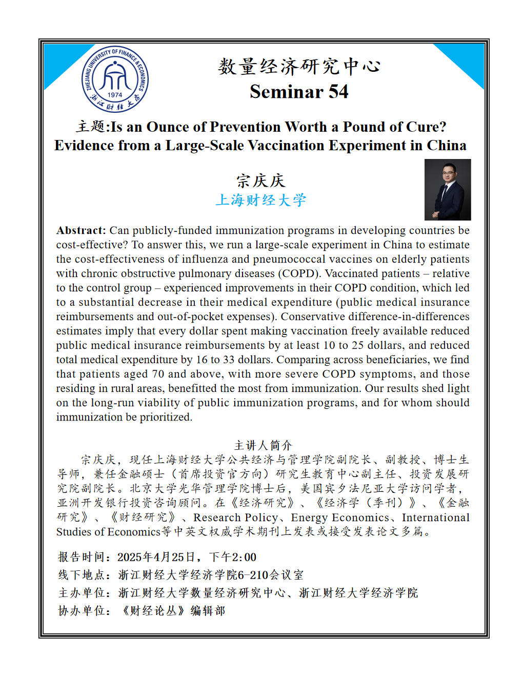 宗庆庆,现任上海财经大学公共经济与管理学院副院长、副教授、博士生导师,兼任金融硕士(首席投资官方向)研究生教育中心副主任、投资发展研究院副院长。北京大学光华管理学院博士后,美国宾夕法尼亚大学访问学者,亚洲开发银行投资咨询顾问。在《经济研究》、《经济学(季刊)》、《金融研究》、《财经研究》、Research Policy、Energy Economics、International Studies of Economics等中英文权威学术期刊上发表或接受发表论文多篇。研究成果获“上海市哲学社会科学研究成果奖一等奖” 、“洪银兴经济学奖” 、 “全国财政理论研究成果奖” 、“International Studies of Economics 2022年度最佳论文奖”等奖项。主持国家自然科学基金青年项目、中国博士后科学基金委特别资助项目和面上项目等课题10余项。主持或参与卫健委、财政部等国家部委委托的横向课题多项。