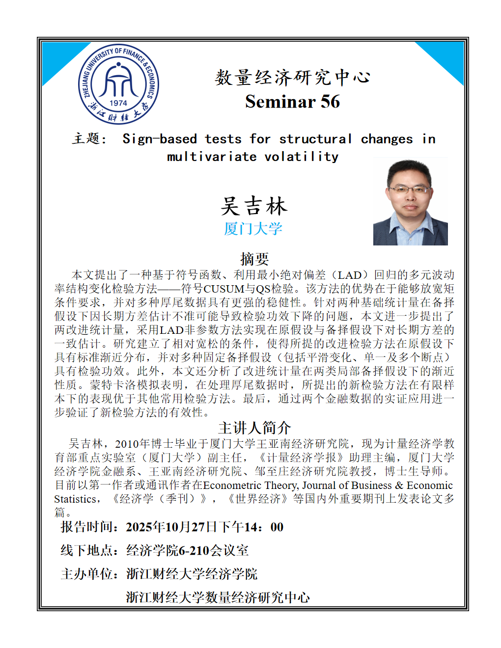 嘉宾介绍:吴吉林。男,浙江安吉人,中国民建党党员, 2010年博士毕业于厦门大学王亚南经济研究院,现为计量经济学教育部重点实验室(厦门大学)副主任,《计量经济学报》助理主编,厦门大学哔咔
