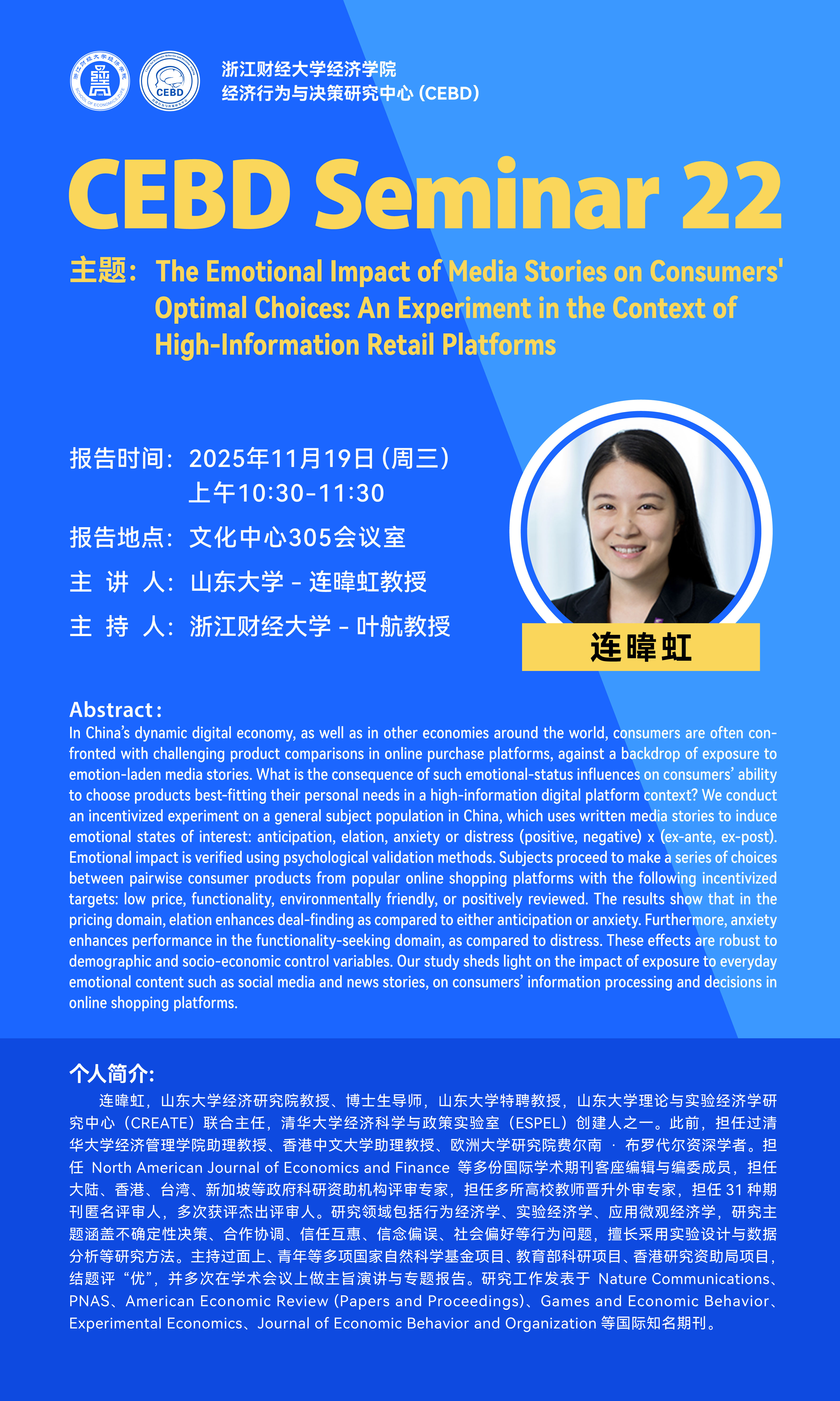 连暐虹,山东大学经济研究院教授、博士生导师,山东大学特聘教授,山东大学理论与实验经济学研究中心(CREATE)联合主任,清华大学经济科学与政策实验室(ESPEL)创建人之一。此前,担任过清华大学经济管理学院助理教授、香港中文大学助理教授、欧洲大学研究院费尔南·布罗代尔资深学者。担任North American Journal of Economics and Finance等多份国际学术期刊客座编辑与编委成员,担任大陆、香港、台湾、新加坡等政府科研资助机构评审专家,担任多所高校教师晋升外审专家,担任31种期刊匿名评审人,多次获评杰出评审人。研究领域包括行为经济学、实验经济学、应用微观经济学,研究主题涵盖不确定性决策、合作协调、信任互惠、信念偏误、社会偏好等行为问题,擅长采用实验设计与数据分析等研究方法。主持过面上、青年等多项国家自然科学基金项目、教育部科研项目、香港研究资助局项目,结题评“优”,并多次在学术会议上做主旨演讲与专题报告。研究工作发表于Nature Communications、PNAS、American Economic Review (Papers and Proceedings)、Games and Economic Behavior、Experimental Economics、Journal of Economic Behavior and Organization等国际知名期刊。