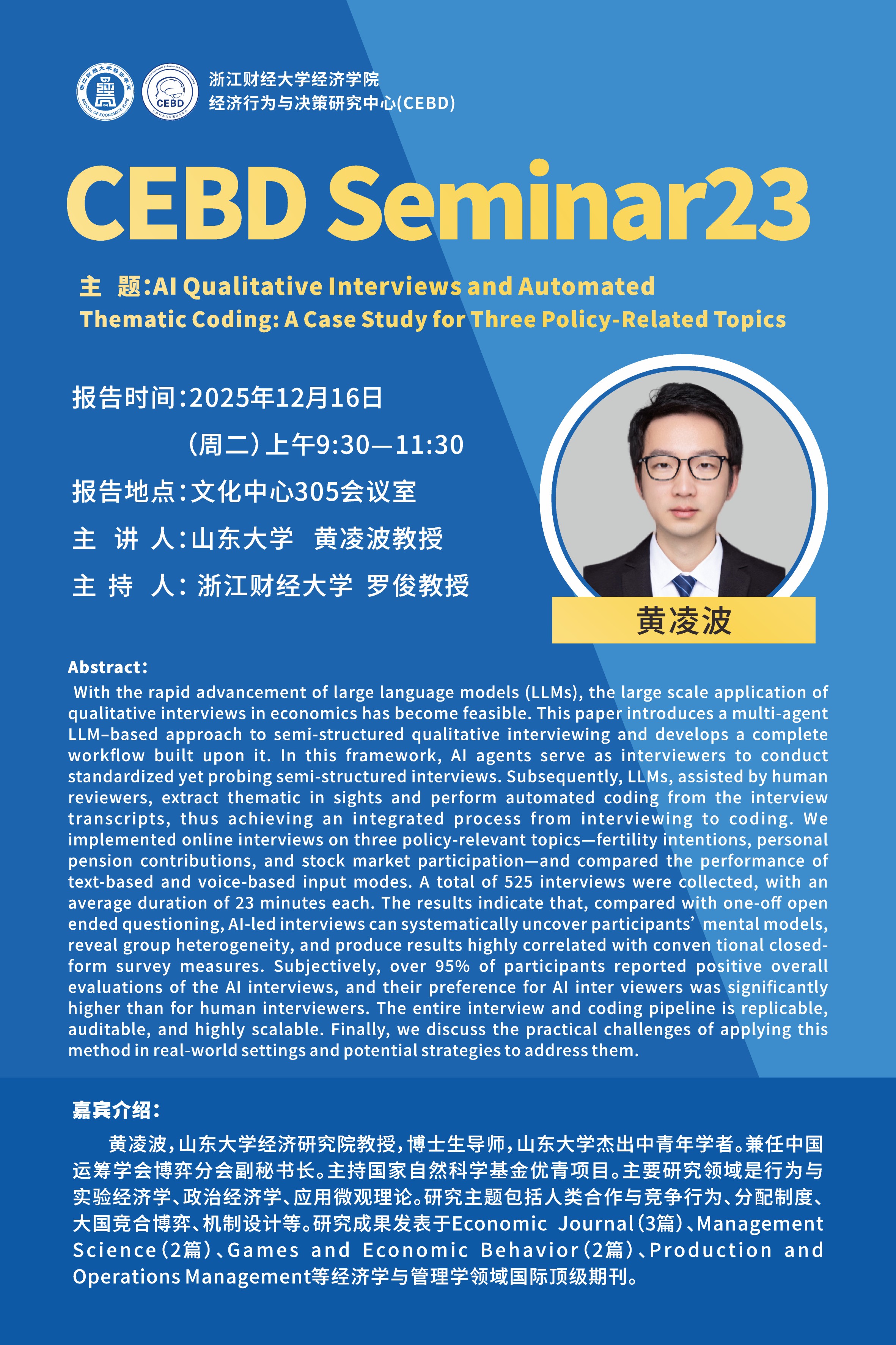 黄凌波,山东大学经济研究院教授,博士生导师,山东大学杰出中青年学者。兼任中国运筹学会博弈分会副秘书长。主持国家自然科学基金优青项目。主要研究领域是行为与实验经济学、政治经济学、应用微观理论。研究主题包括人类合作与竞争行为、分配制度、大国竞合博弈、机制设计等。研究成果发表于Economic Journal(3篇)、Management Science(2篇)、Games and Economic Behavior(2篇)、Production and Operations Management等经济学与管理学领域国际顶级期刊。