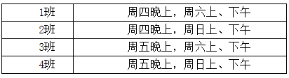 课程计划在11月17日开始,大概需要5周的时间。上课时间为周四晚上、周五晚上、周六全天和周日全天,学生可以根据自己的时间选择班次,课程的基本规则是每周不超过3次课,班次列表大概如表1所示,课程实训模块介绍见表2。教室另行通知。