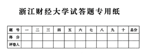 1.任课老师要做好本课程的出题工作,所有课程均需出A、B卷及答案,A、B卷重复不要超过1/3,且与前面三次考核试卷雷同不能超过一半。试卷题量适中,部分题要有一定灵活度,试卷及参考答案统一采用规范表头,标准格式可从学院网站下载中心下载。务必注意试卷的保密性,印卷与封卷需领取文印单和封卷通知书。封卷前,请到教学办领取考生签到单、监考须知和违纪情况记录表。封装时注意答题纸的格式,通常封装有得分框的答题专用纸,如图所示: