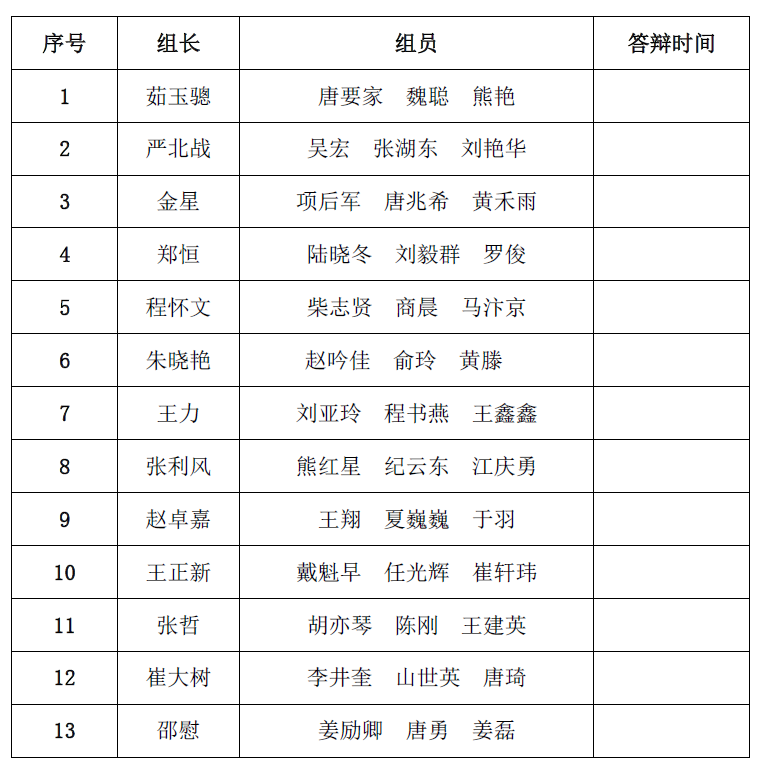 按照学校《关于2016届本科生毕业论文(设计)工作安排的通知》的要求,确保哔咔 2016届毕业生毕业论文开题答辩工作高效、有序开展,同时方便各答辩组教师灵活安排,学院决定采用分组、分时的方式进行开题答辩,拟安排在5月23日-29日进行毕业论文答辩。现将答辩教师分组公布如下,请各组长在5月16日(下周一)10点前确定时间告知教学办公室。