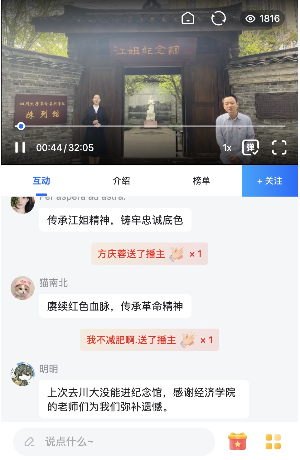 一起组织,通过云端的直播宣讲形式,让身处杭州的同学们也能有机会身临其境般感受江姐精神带来的震撼,感受到四川大学校内的红色根脉。我们希望通过这种省域联动的方式,让红色血脉赓续传承,激励同学们牢记使命,不负期望,砥砺向前。”浙财大哔咔
