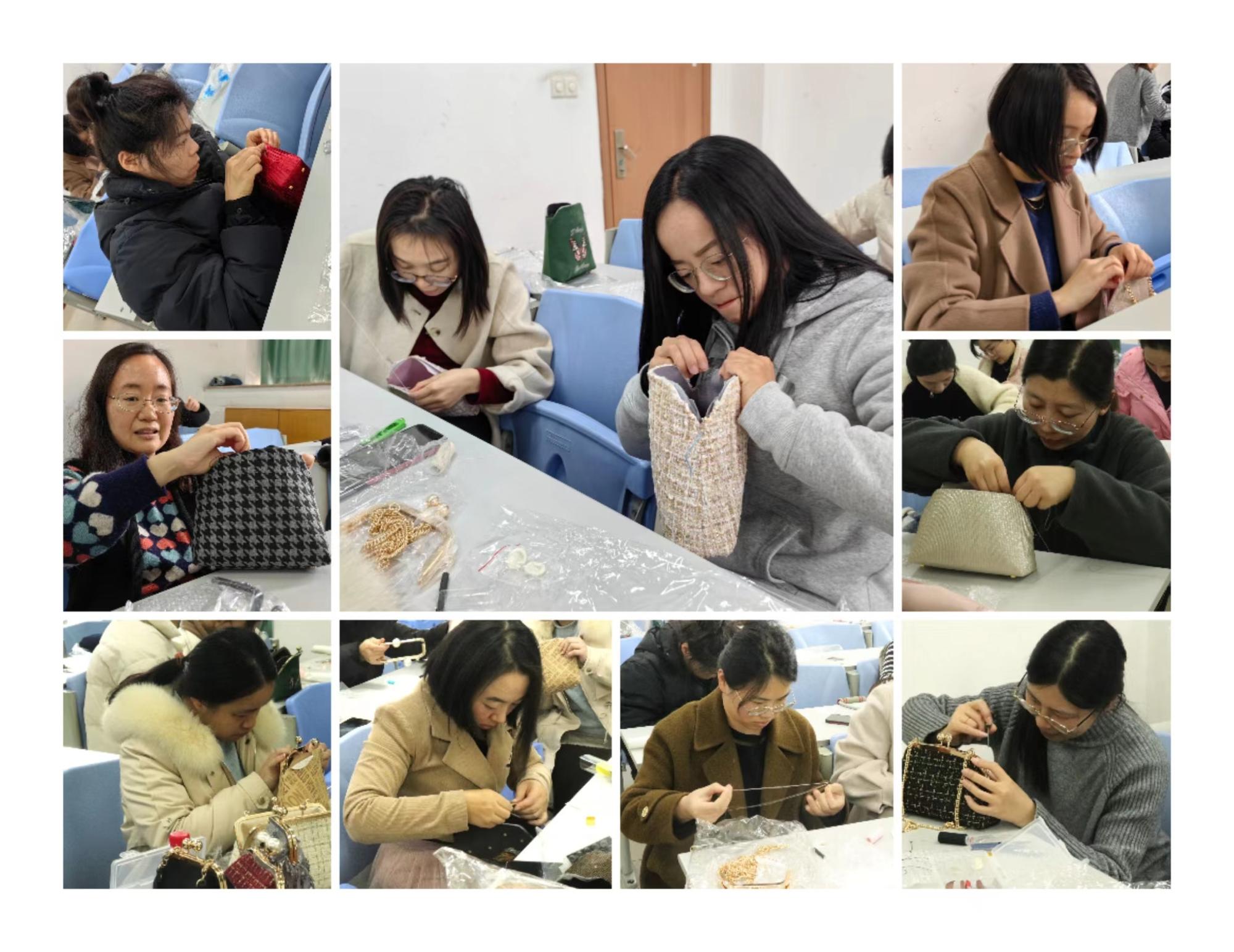制作过程中,老师们选取自己喜欢的半成品材料后,按照手工包老师的指导步骤认真进行缝制、卡夹、拧合。老师们时而自己动手,时而合作拧螺丝,在愉快轻松的环境里,包包制作过程中的各种问题都迎刃而解,一个个精美时尚的手工包就此出品。