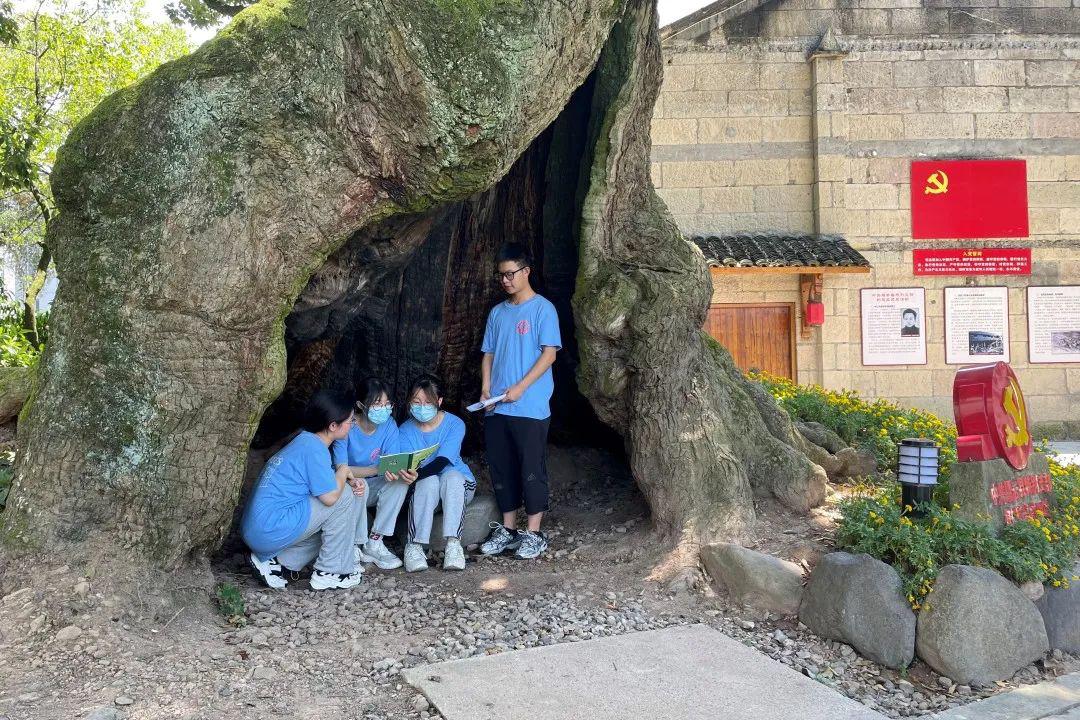 实践服务团来到双溪口村文化礼堂西侧的中共缙云县委特别支部树洞会议旧址,聆听和学习古树背后的故事。听完蔡书记的介绍,队员们了解到,1939年,中共缙云县特别支部书记雷克坚,以省国民政府建设厅合作工作队缙云工作组长身份,率全组人员进驻到双溪口村,开展抗日救亡和党的秘密工作,对全县革命斗争取得胜利发挥了至关重要的作用。中共缙云县特别支部第一次会议,就是在这棵千年苦槠树的树洞里秘密举行。这棵饱经沧桑的千年苦槠,见证了党的百年发展史,以更加顽强的生命力焕发出无限生机,正如我们共产党人一路披荆斩棘,砥砺前行。实践团在树洞中开展实践微课分享,以雷克坚的革命事迹为切入点,交流学习心得,了解老一辈共产党人艰苦卓绝的革命历程。