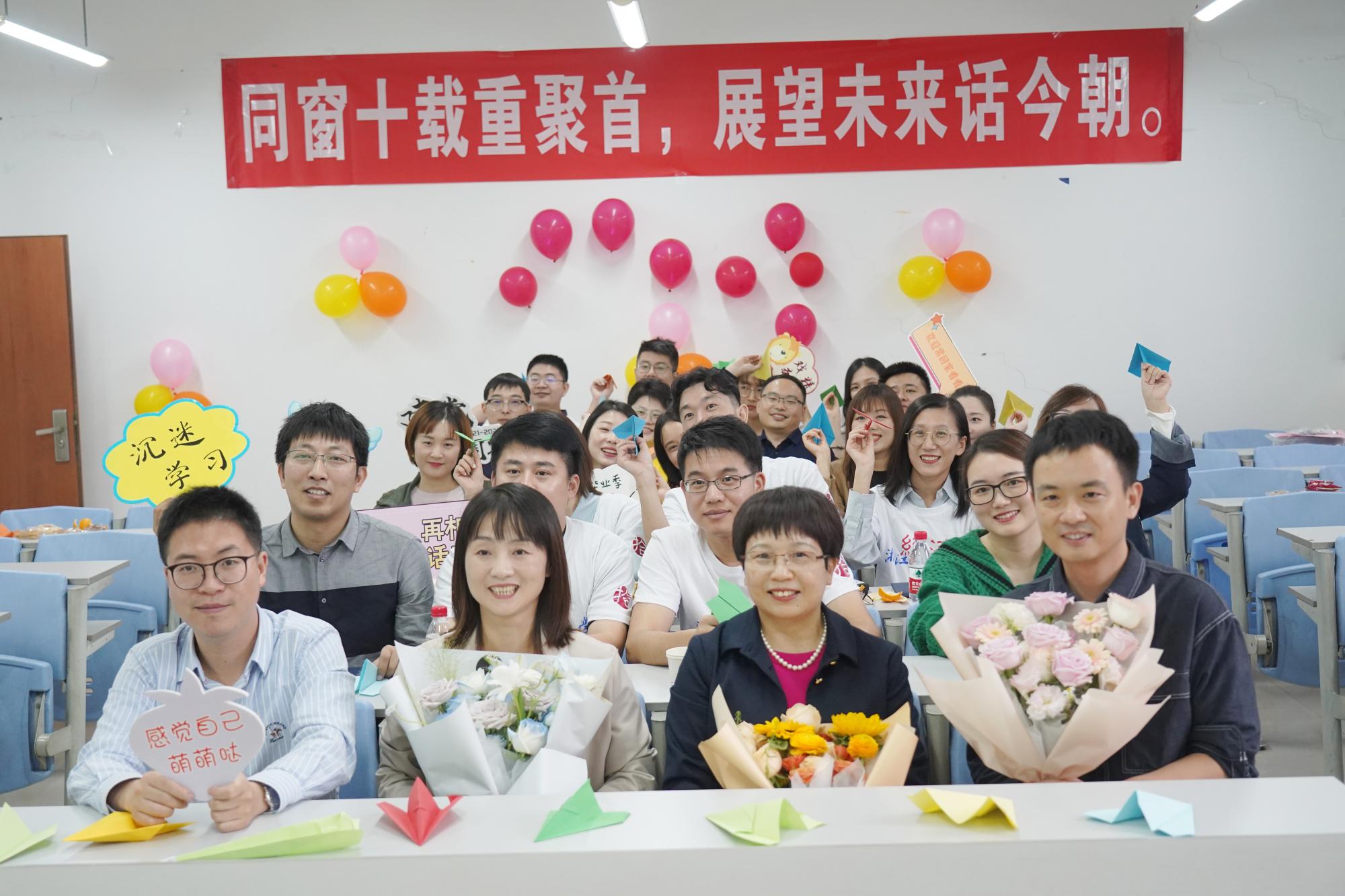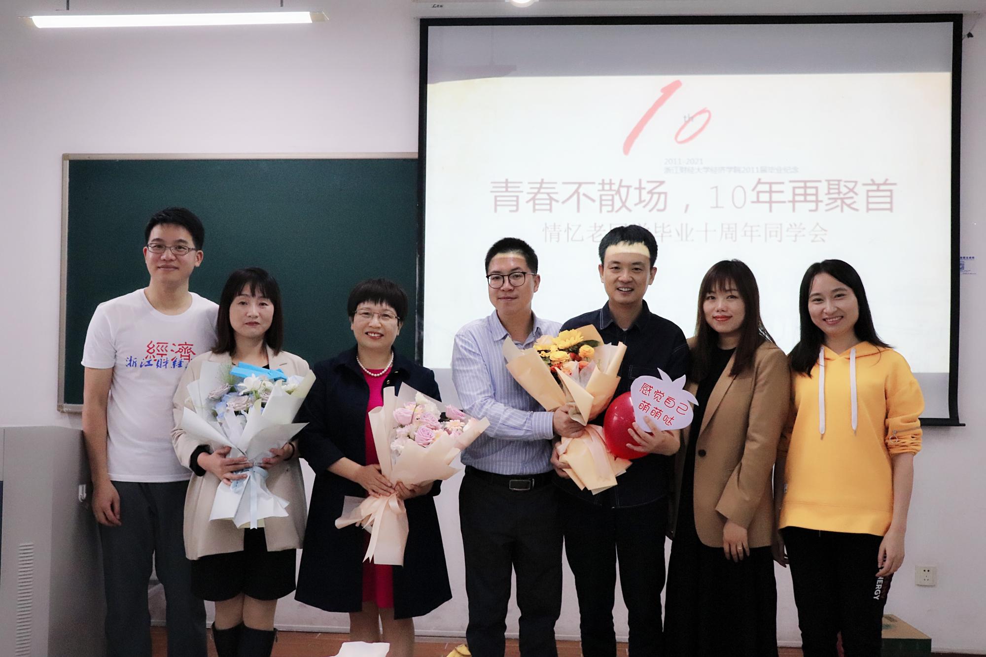 下午2时,返校班级见面会在学院楼107教室举行。再度重逢,同学们相互分享了彼此的工作、生活,重温校园时光,共叙桃李情怀,并向母校、恩师表达了诚挚的谢意和衷心的祝福。会议伊始,胡亦琴代表学院对校友们回到浙财表示热烈的欢迎,并从学院的发展历程、学科分布、师生规模等方面对学院的整体情况进行了介绍。崔泰铭向与会校友介绍了学院校友工作取得的进展与成效,他提到,学院的成就离不开校友的贡献,并对关心和支持学院发展的校友们致以最衷心的感谢。活动现场还举行了学业成礼仪式,胡亦琴为校友代表颁发毕业证书。校友代表上台为教师代表献花,一句句问候,一声声祝福,使在场的许多校友回想起学生时代和老师的点点滴滴,不禁热泪盈眶。天高海阔师恩仁厚,德泽源远母校情深!