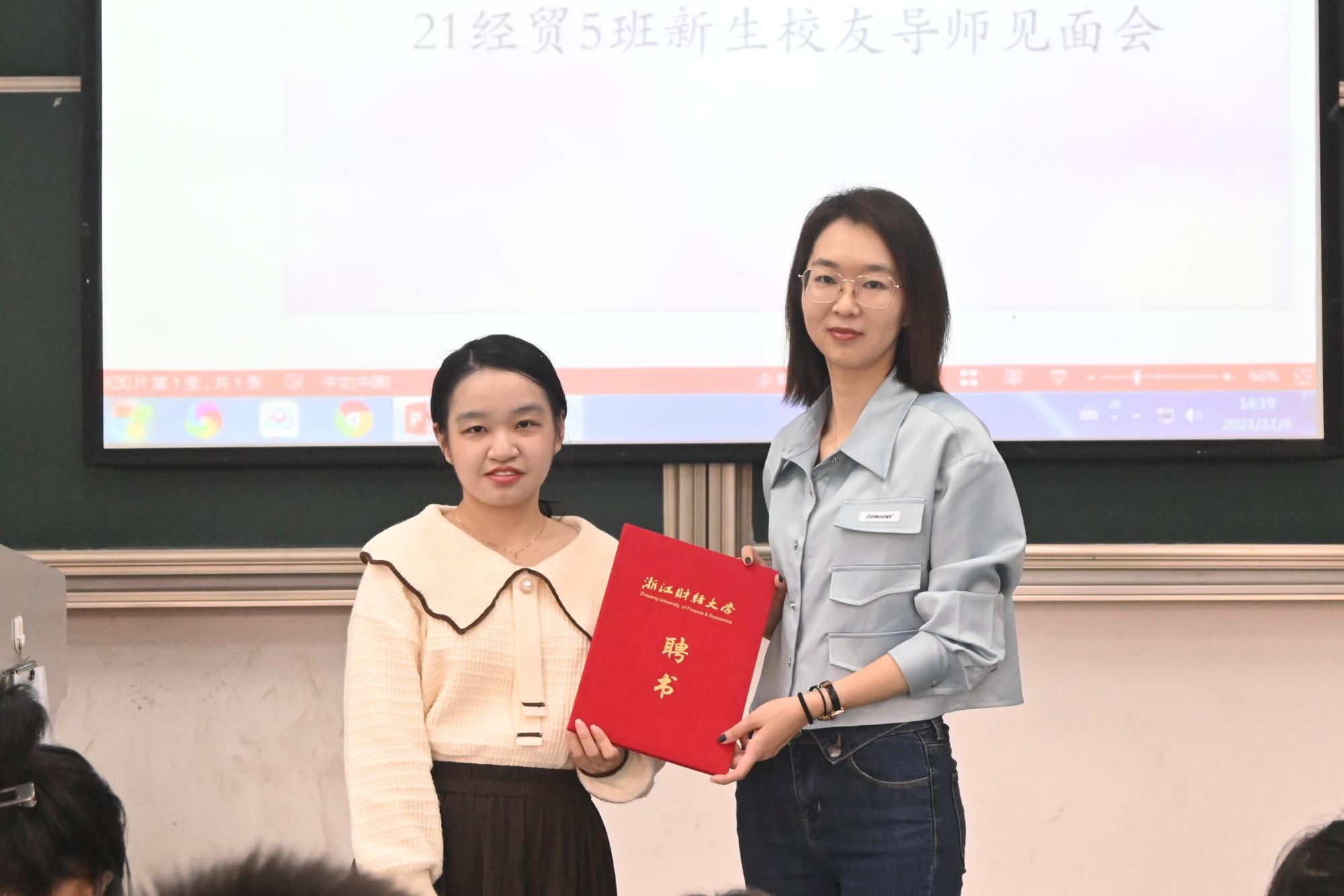 新生校友导师见面会”陆续在学院楼各教室举行。辅导员曹仲晔、邓斯怡、俞一献为校友颁发聘书,并代表学校向各位校友积极参与学校人才培养表示衷心的感谢。李清雅、胡琴、陈中海等9位校友成为了2021级新生班级的校友导师。校友们在与同学的接触过程中言传身教,现身说法,帮助同学们结合国家社会需要,深入思考未来发展方向,在价值引领、能力提升等方面对同学们切实发挥引领带动作用,2021级新生参加本次活动。