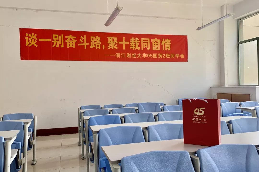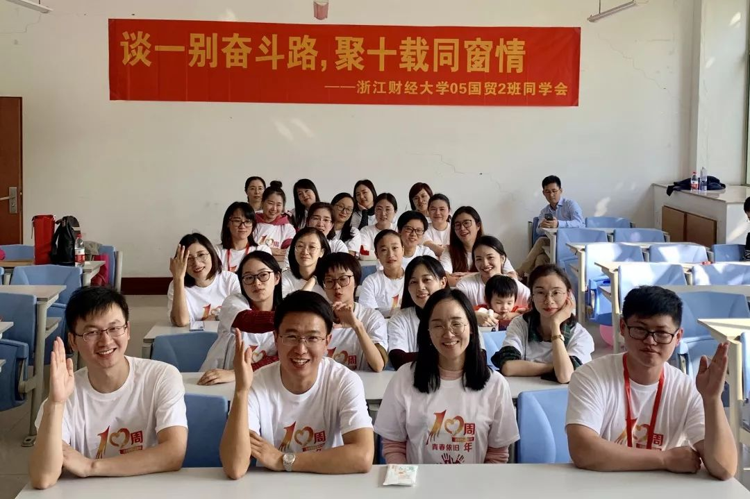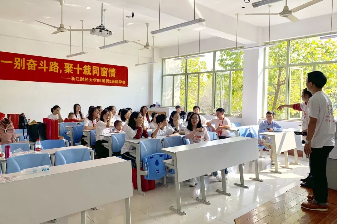 05届国贸2班校友着统一的班服,坐在阔别已久的教室,仿佛又回到那段青葱岁月。