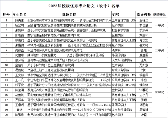 根据《哔咔 本科生优秀毕业论文(设计)奖、毕业论文(设计)优秀指导教师评选办法》文件精神,经学院人才培养委员会评审并推荐、学校组织专家组评审,陈禹康等同学的20篇毕业论文(设计) 被评为2023届校级优秀毕业论文(设计),贺锦江等20名指导教师被评为毕业论文(设计)优秀指导教师,现予以公示。对评选结果若有异议,请书面或电话向教务处反映。公示日期:2023年7月3日-7月5日,联系电话87557073。